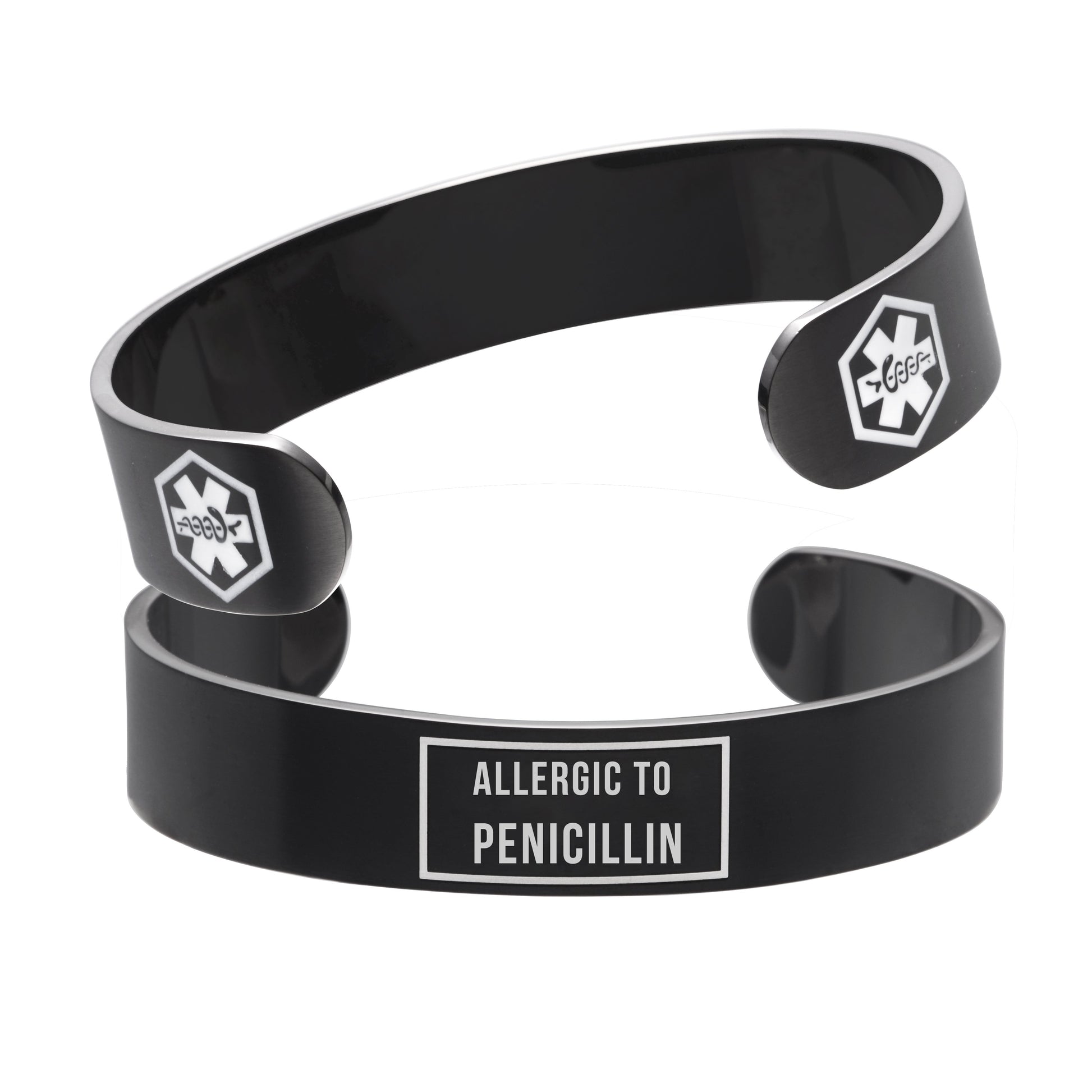 Black Medical Alert Cuff Bracelet-Allergic to Penicillin