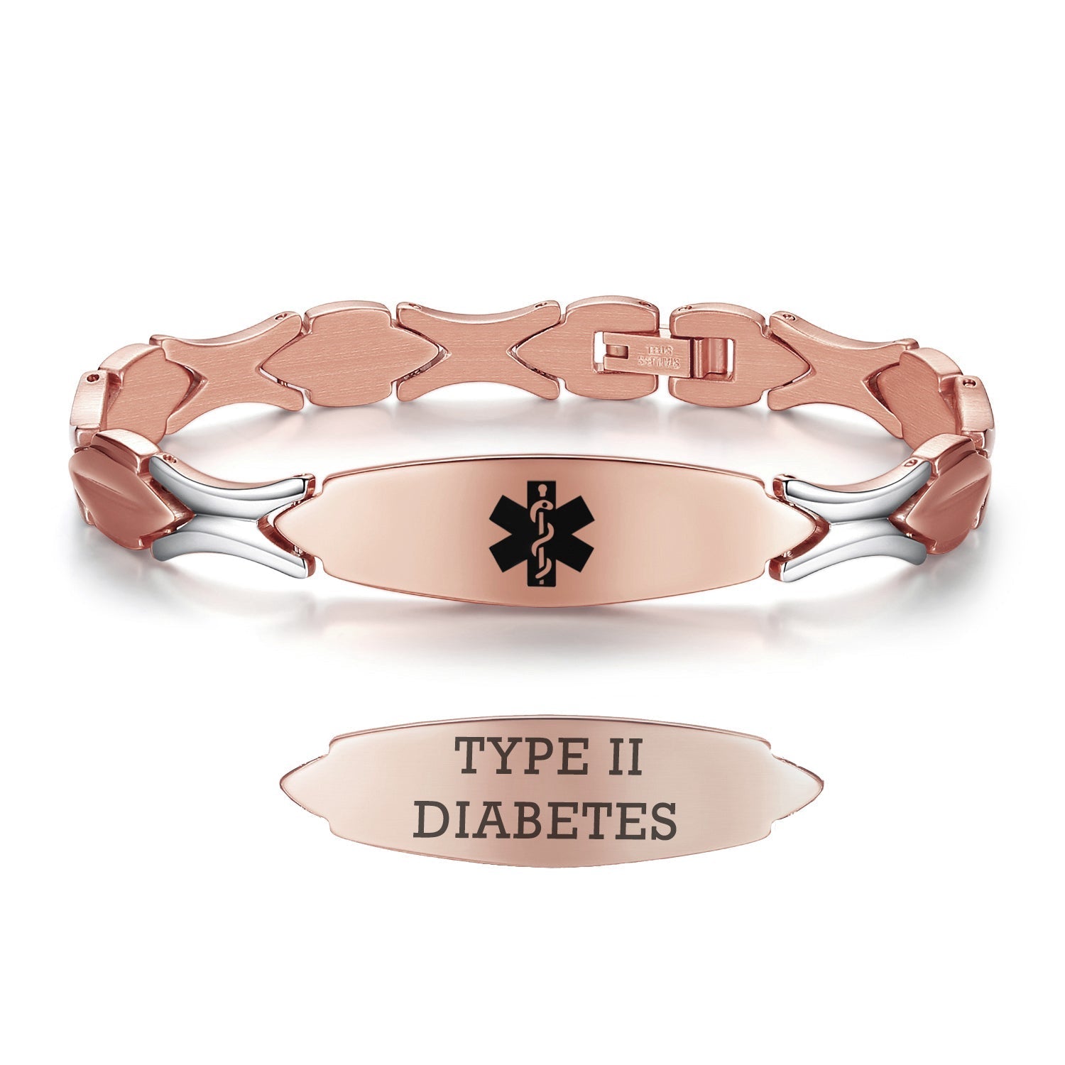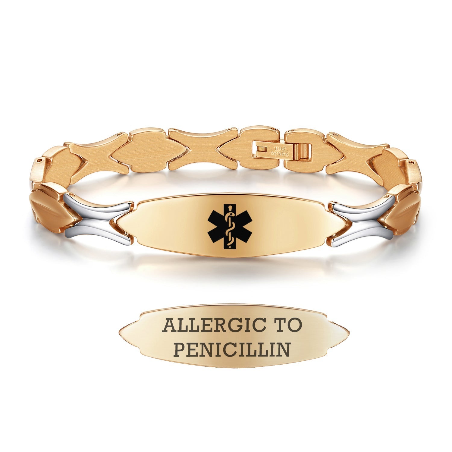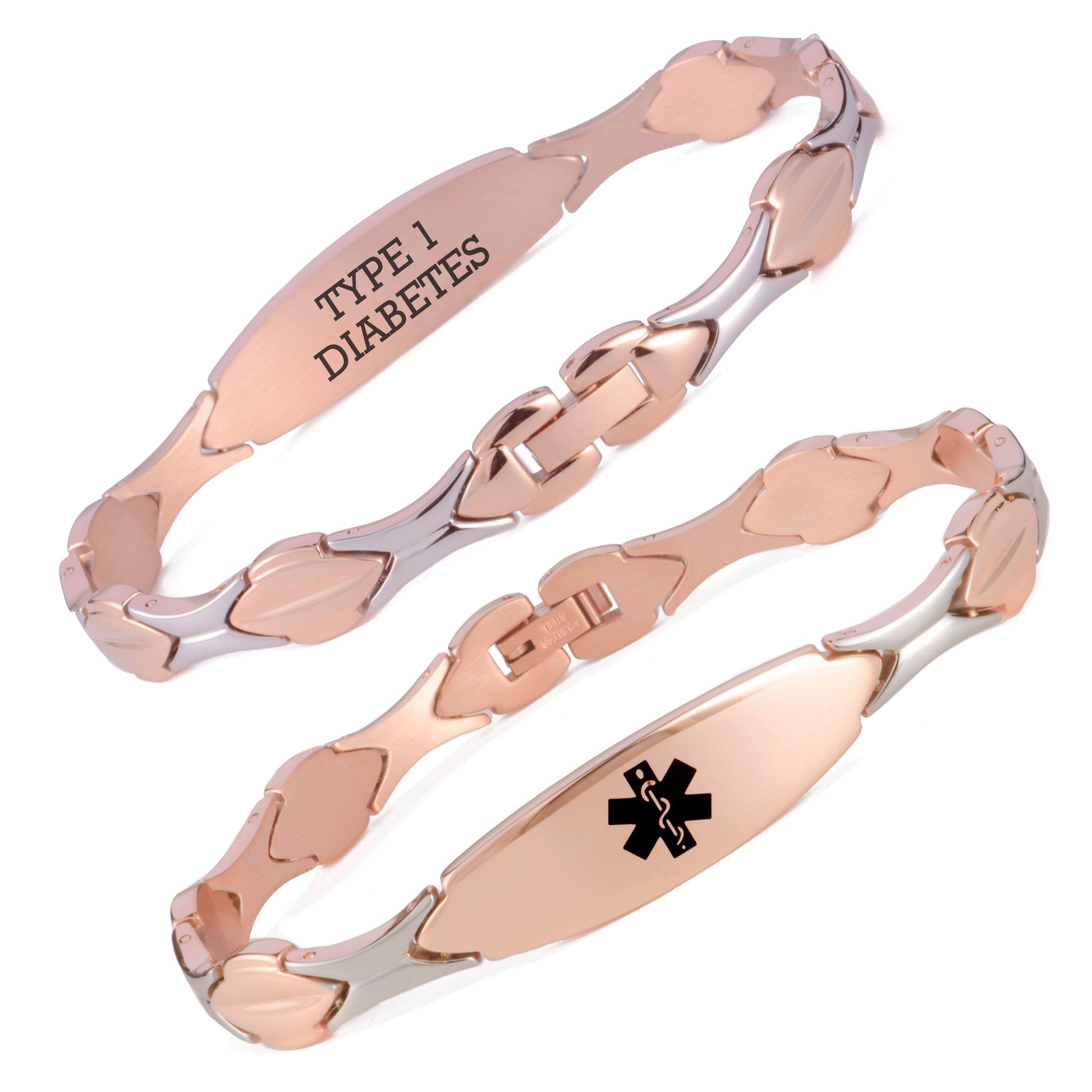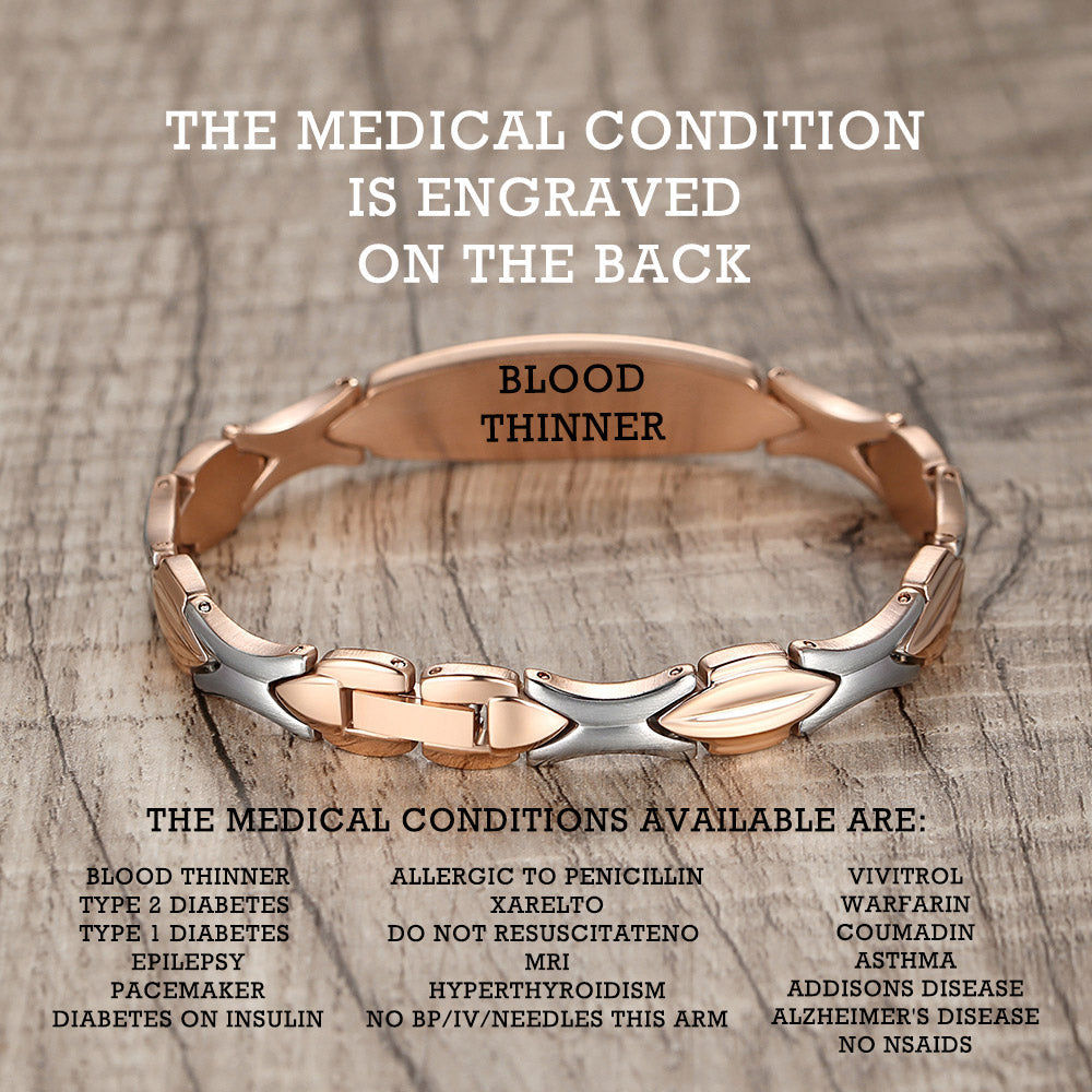 - RELIABLE MATERIAL:Made of high quality 316L stainless steel, with rose gold plating,shiny,non-allergic and waterproof. Dedicated to all the women who love life with this beautiful, well-crafted and lovely medical ID bracelet