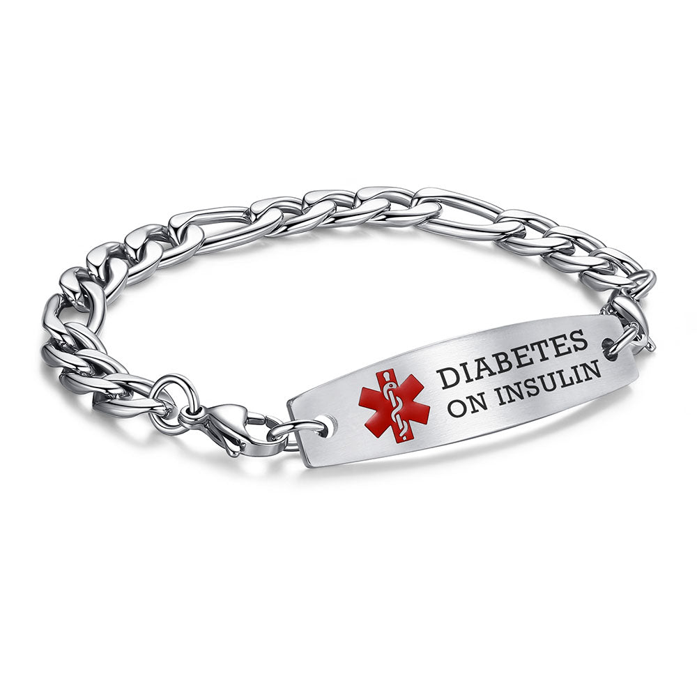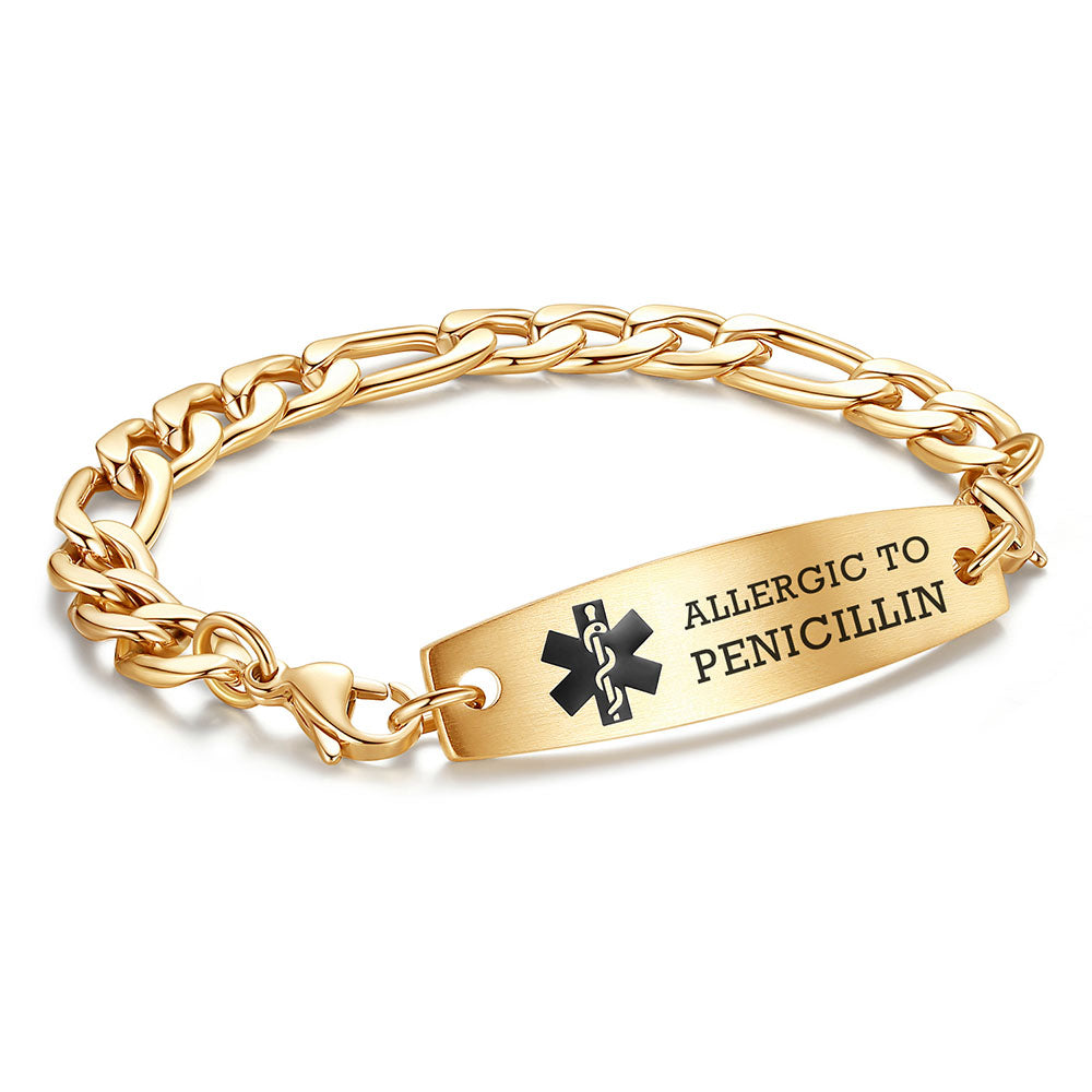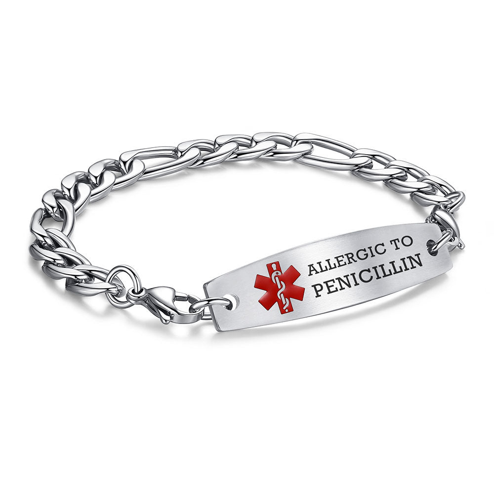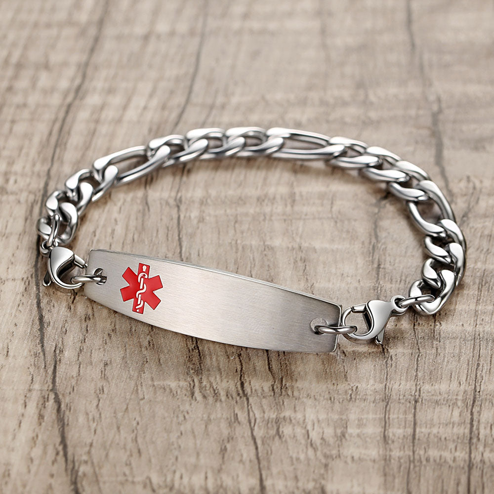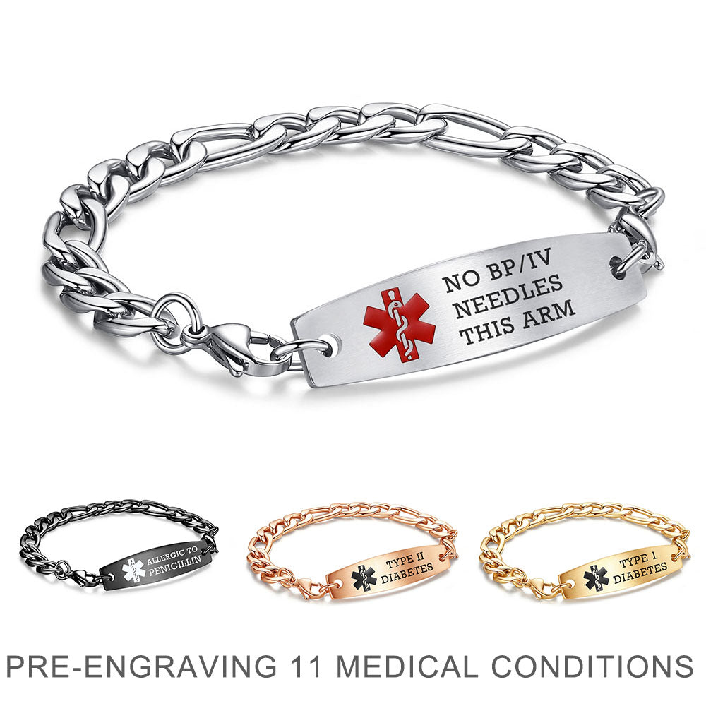- This interchangeable medical id bracelet Material: stainless steel, 9/32 inch width Figaro chain+ classic medical id tags, Means you can replace the bracelet or tag separately,Surgical grade stainless steel, lead-free and nickel-free, waterproof and durable