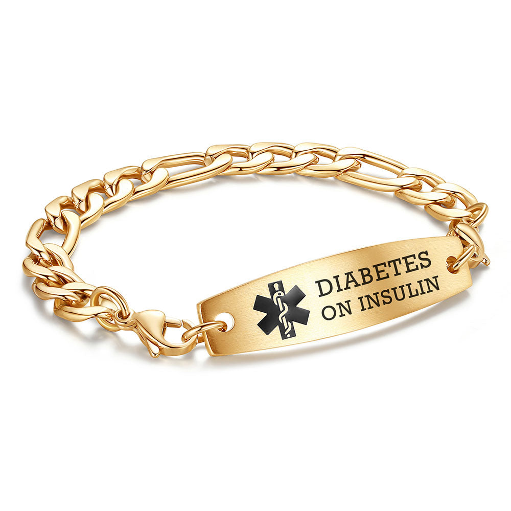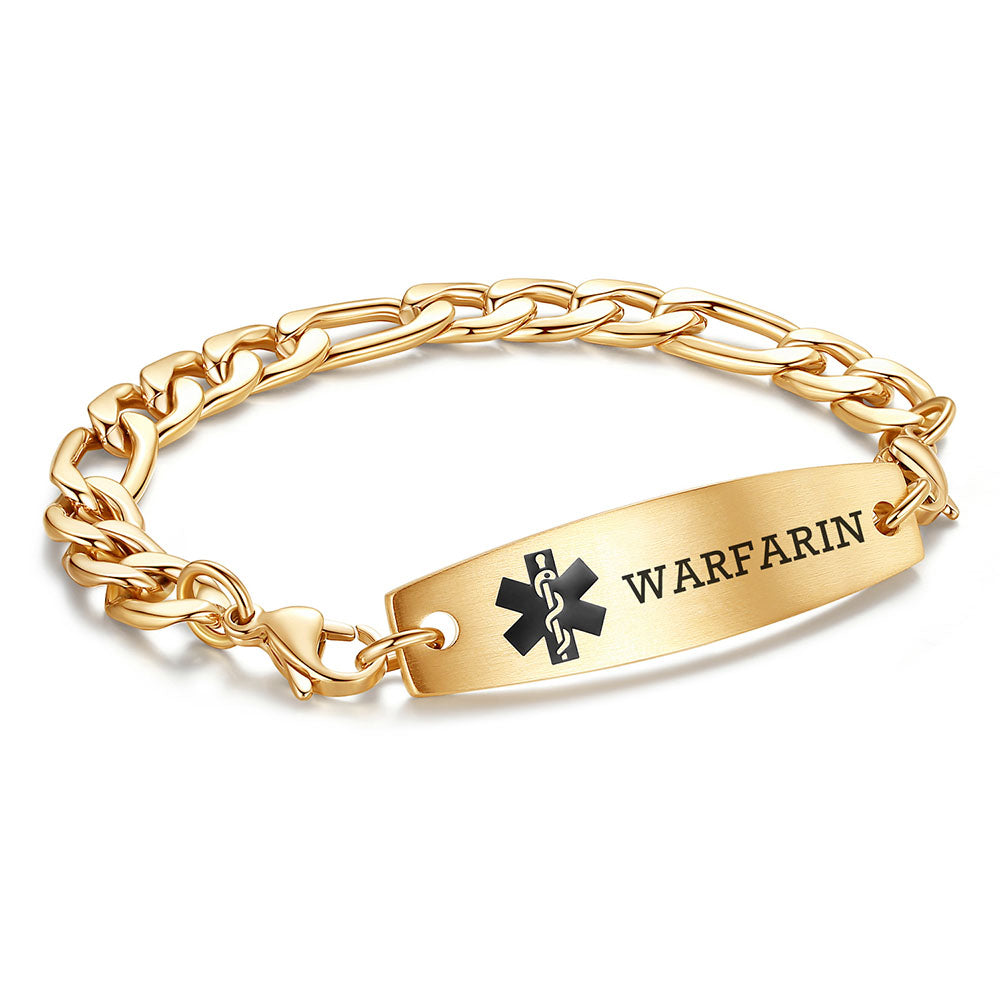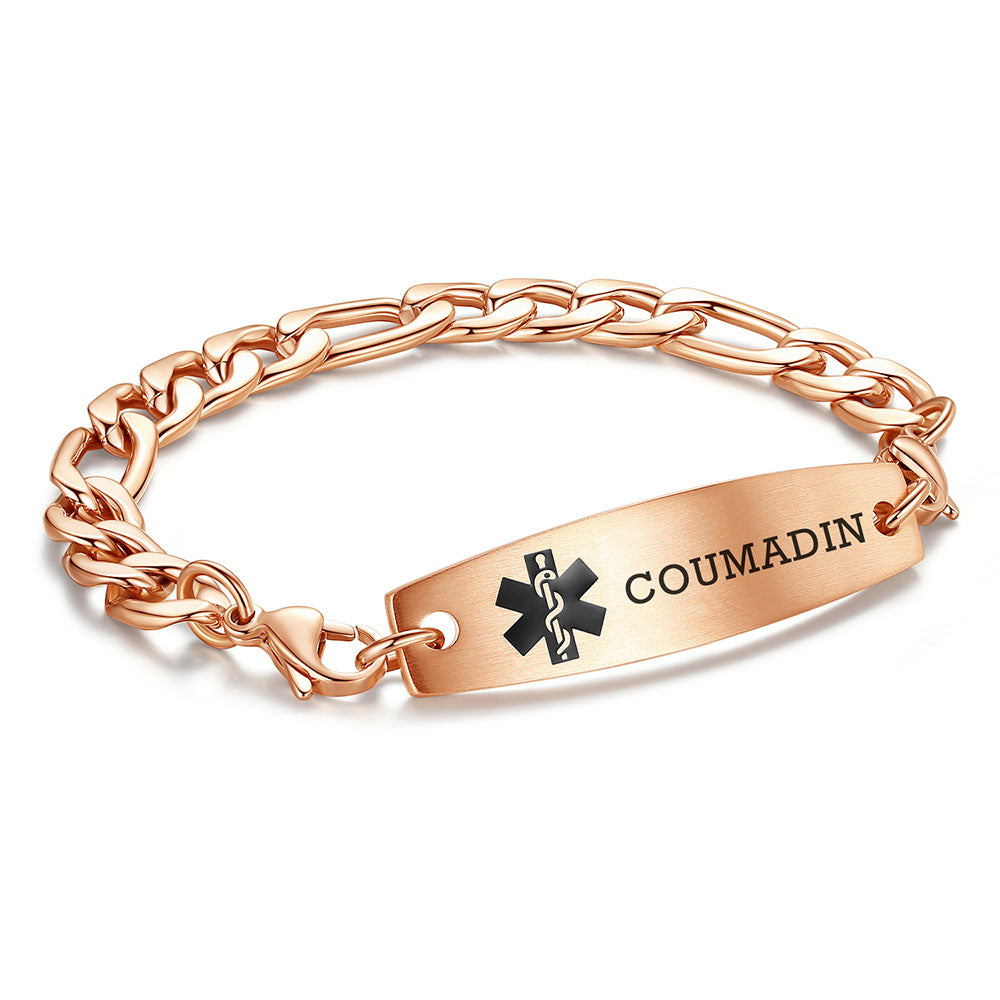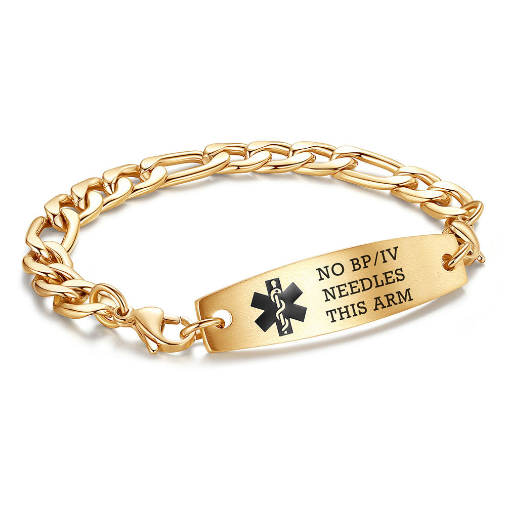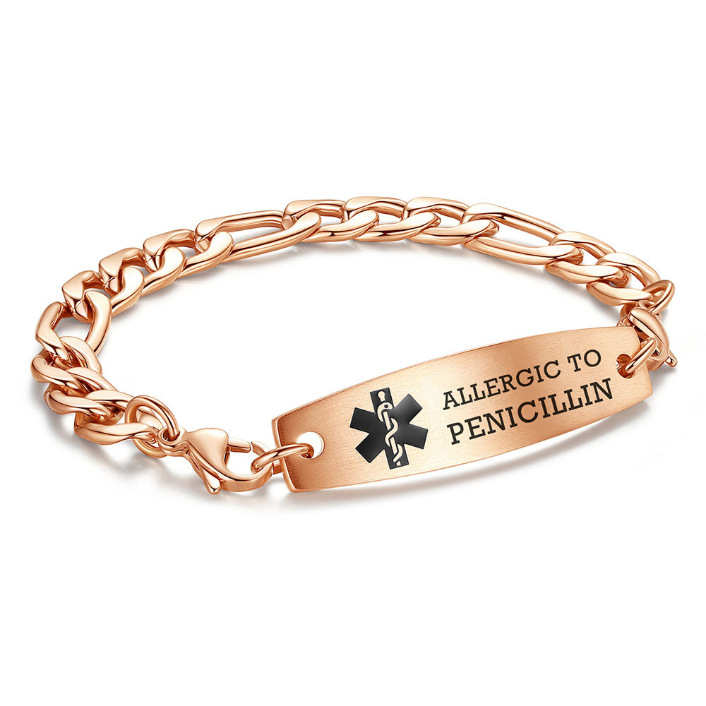 - This interchangeable medical id bracelet Material: stainless steel, 9/32 inch width Figaro chain+ classic medical id tags, Means you can replace the bracelet or tag separately,Surgical grade stainless steel, lead-free and nickel-free, waterproof and durable