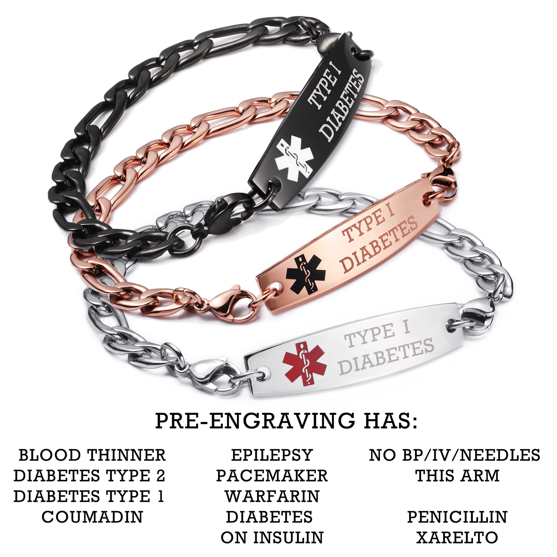 - This Stainless steel medical alert bracelets with pre-engraving 11 medical conditions, upgrade to laser engraving black characters, easier to identify, never disappear
