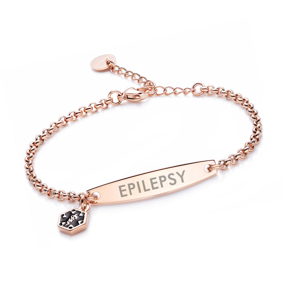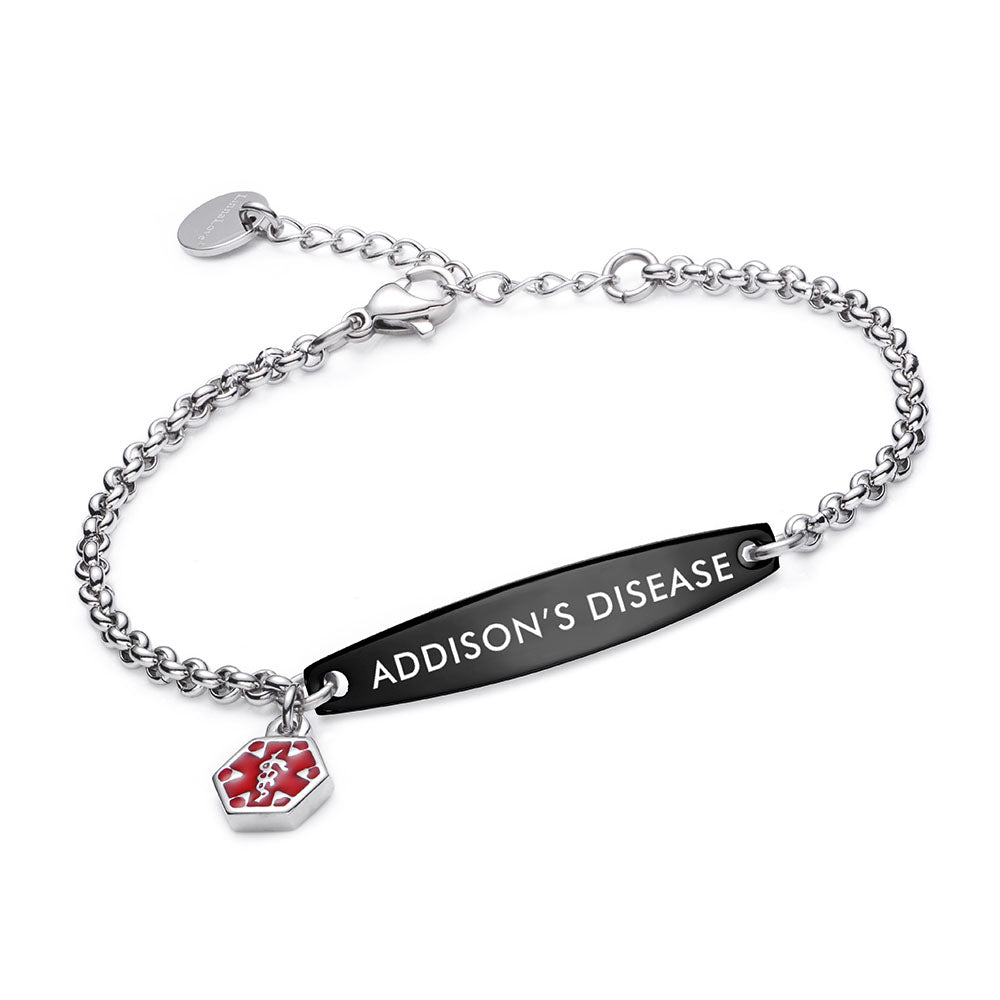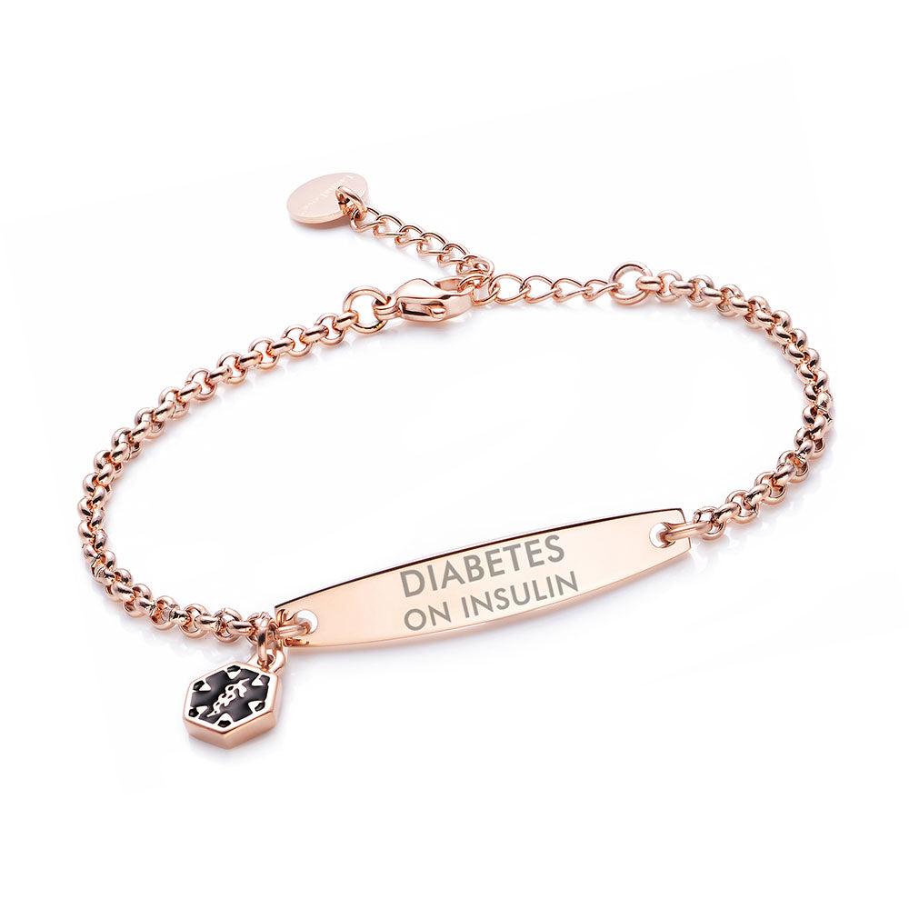 The bracelet features a mini hexagonal charm with a red/black enamel medical ID symbol, along with deep etching of the medical condition on the ID tags to ensure clear visibility without scratching. The 3mm Rolo chain links the medical ID tags and charm, secured by a lobster clasp.