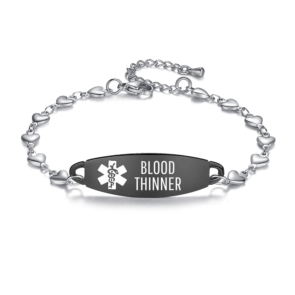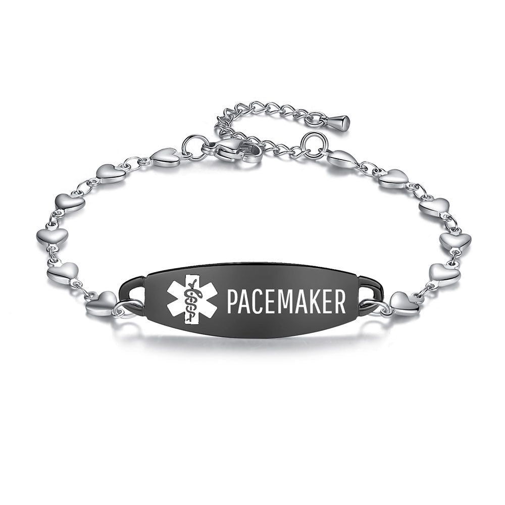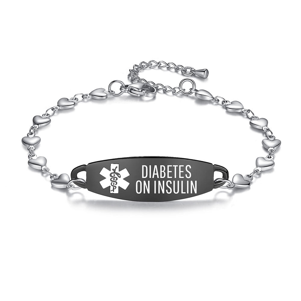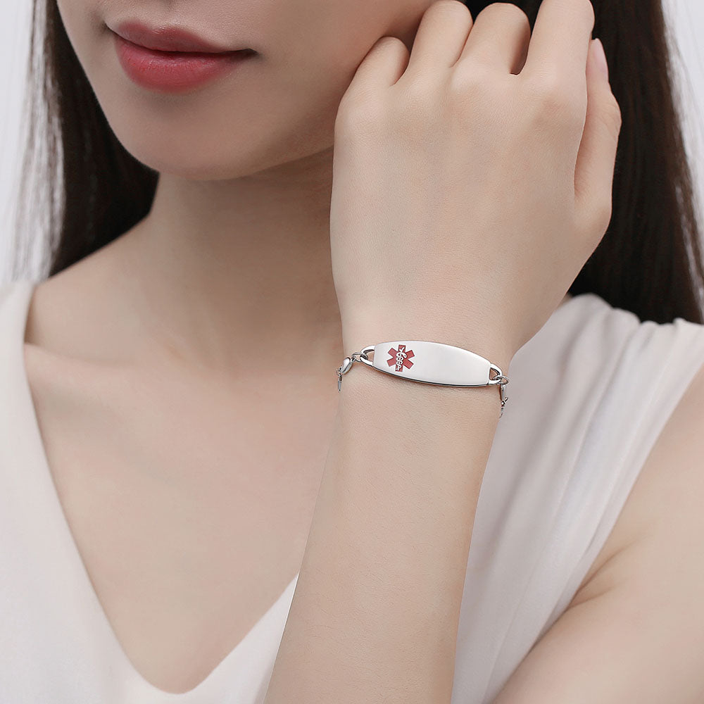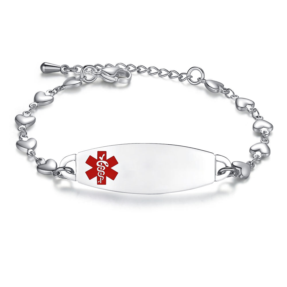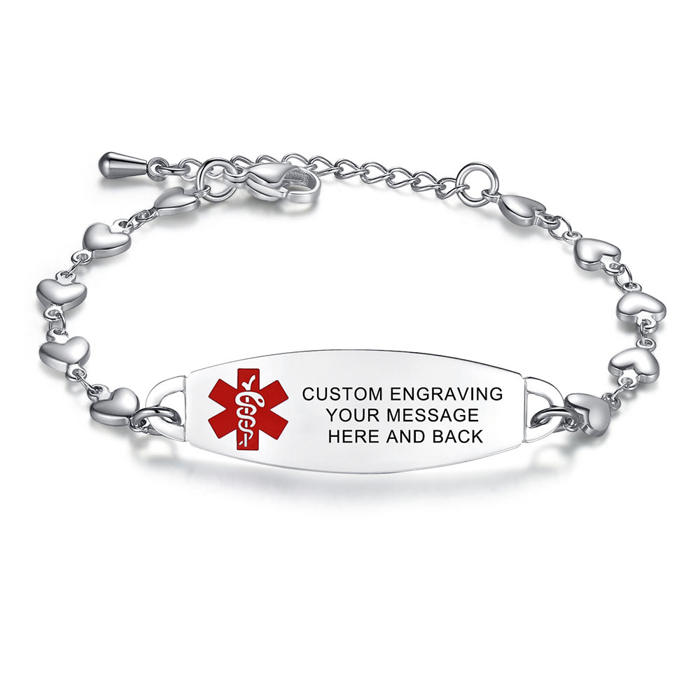 - Lovely heart medical alert bracelets for women,The heart link can fit many women's wrists. It is comfortable to wear and adjustable in size. It is a medical bracelet and a charming fashion jewelry.