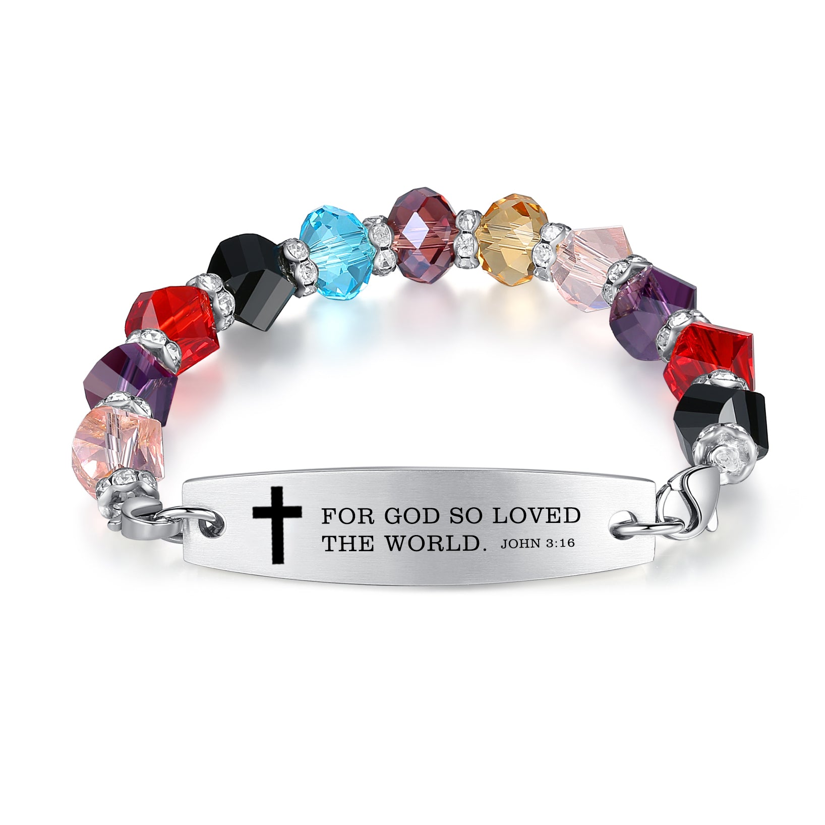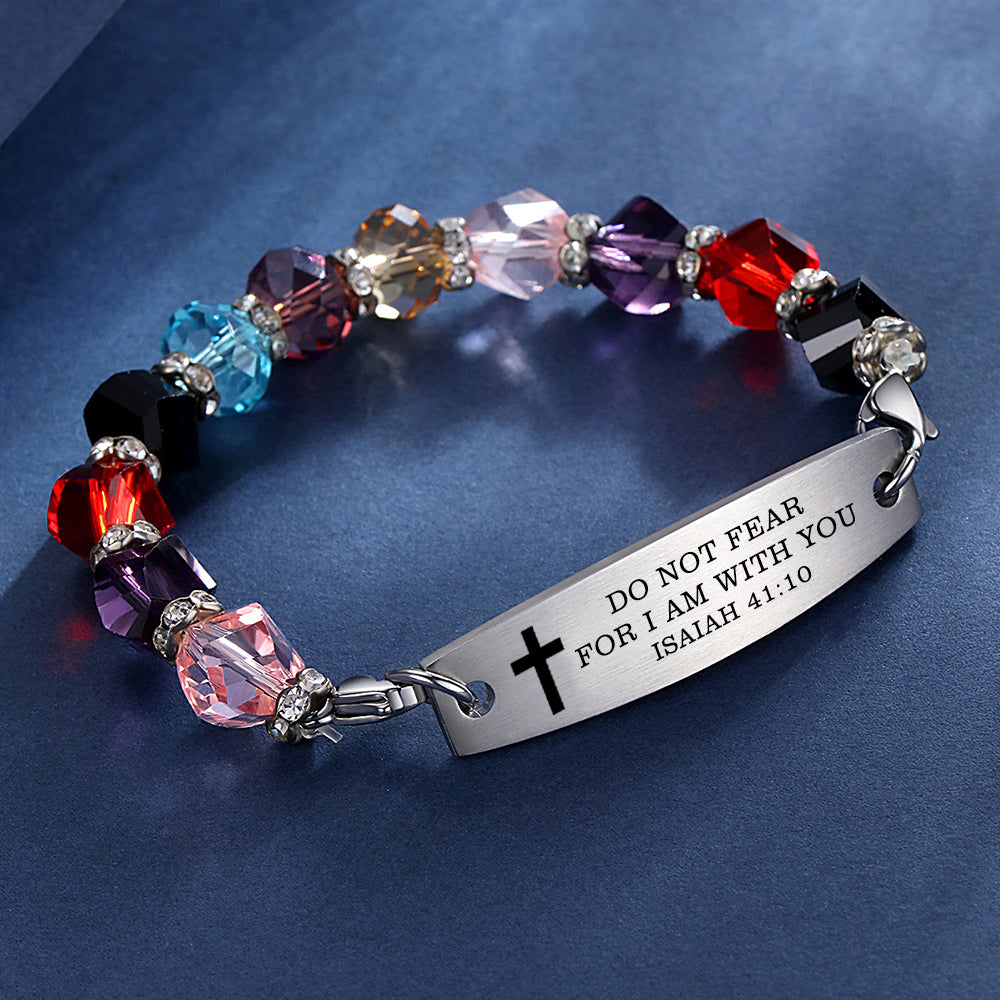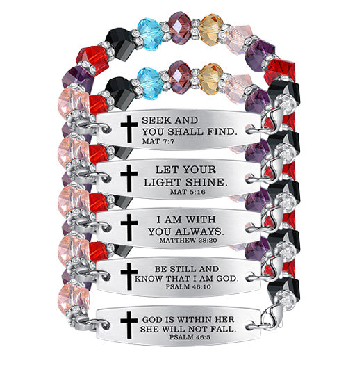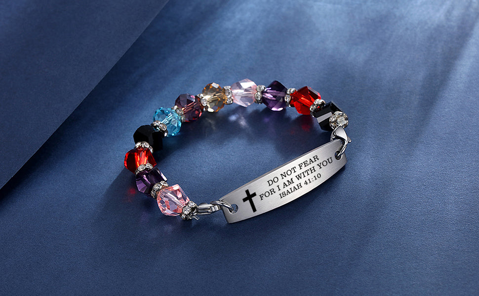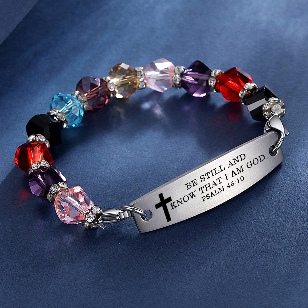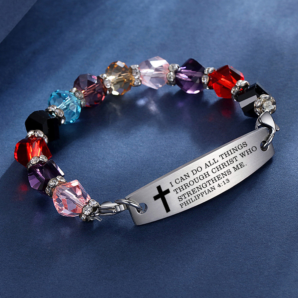 Crafted from 11 vibrant 12mm crystal beads in a spectrum of colors, combined with durable 316L stainless steel, the elastic band ensures a comfortable and flexible fit that gracefully adorns your wrist. Whether worn as a personal symbol of faith or given as a gift, this bracelet carries a message of encouragement and spiritual support.