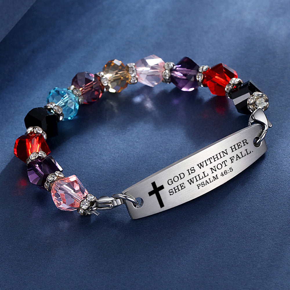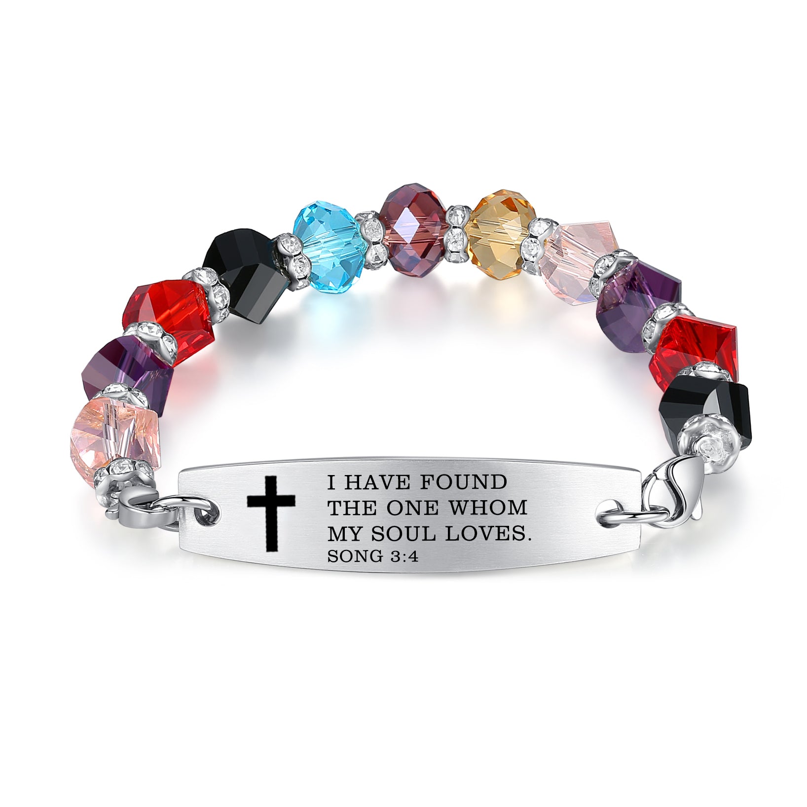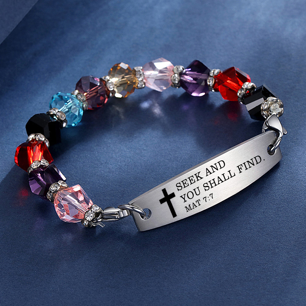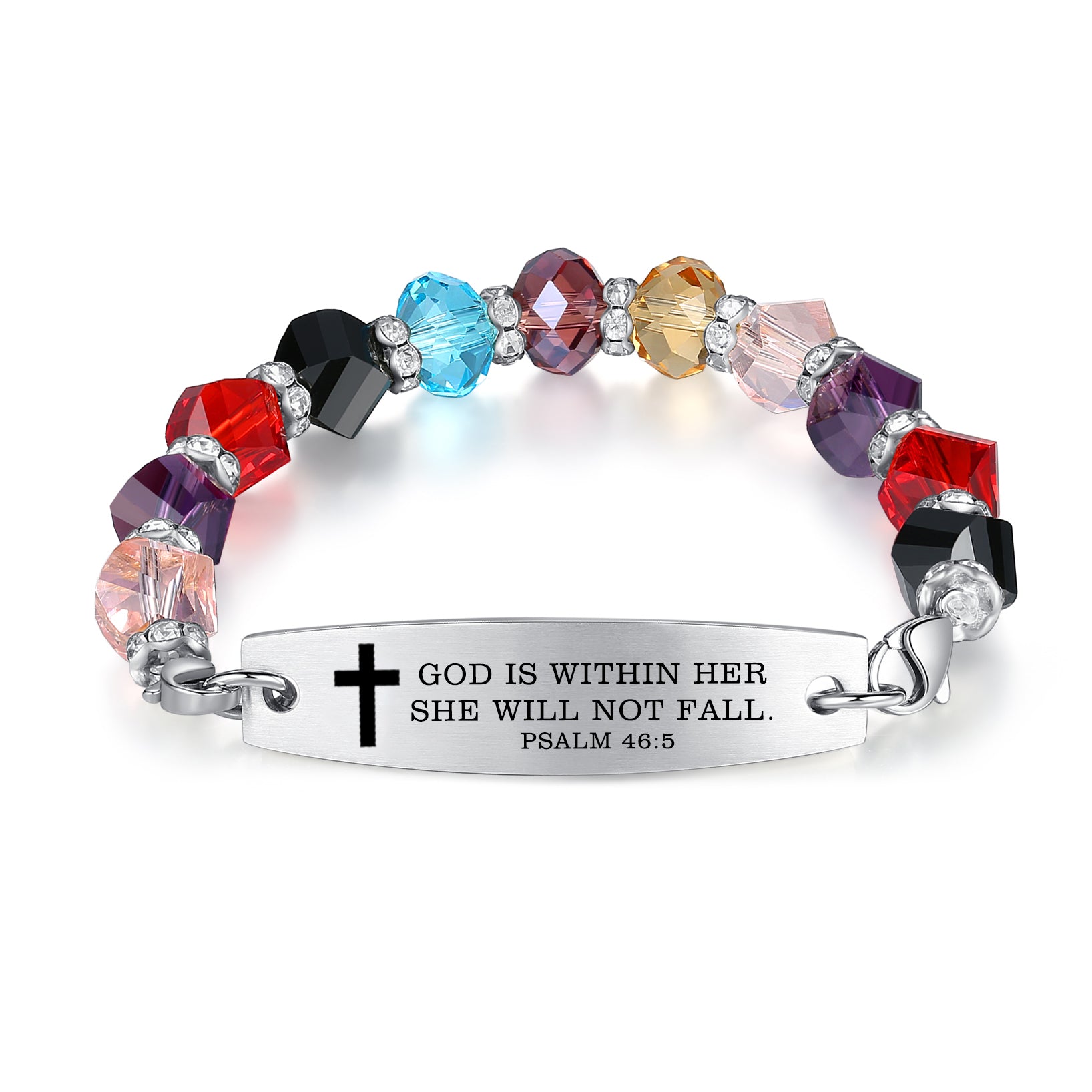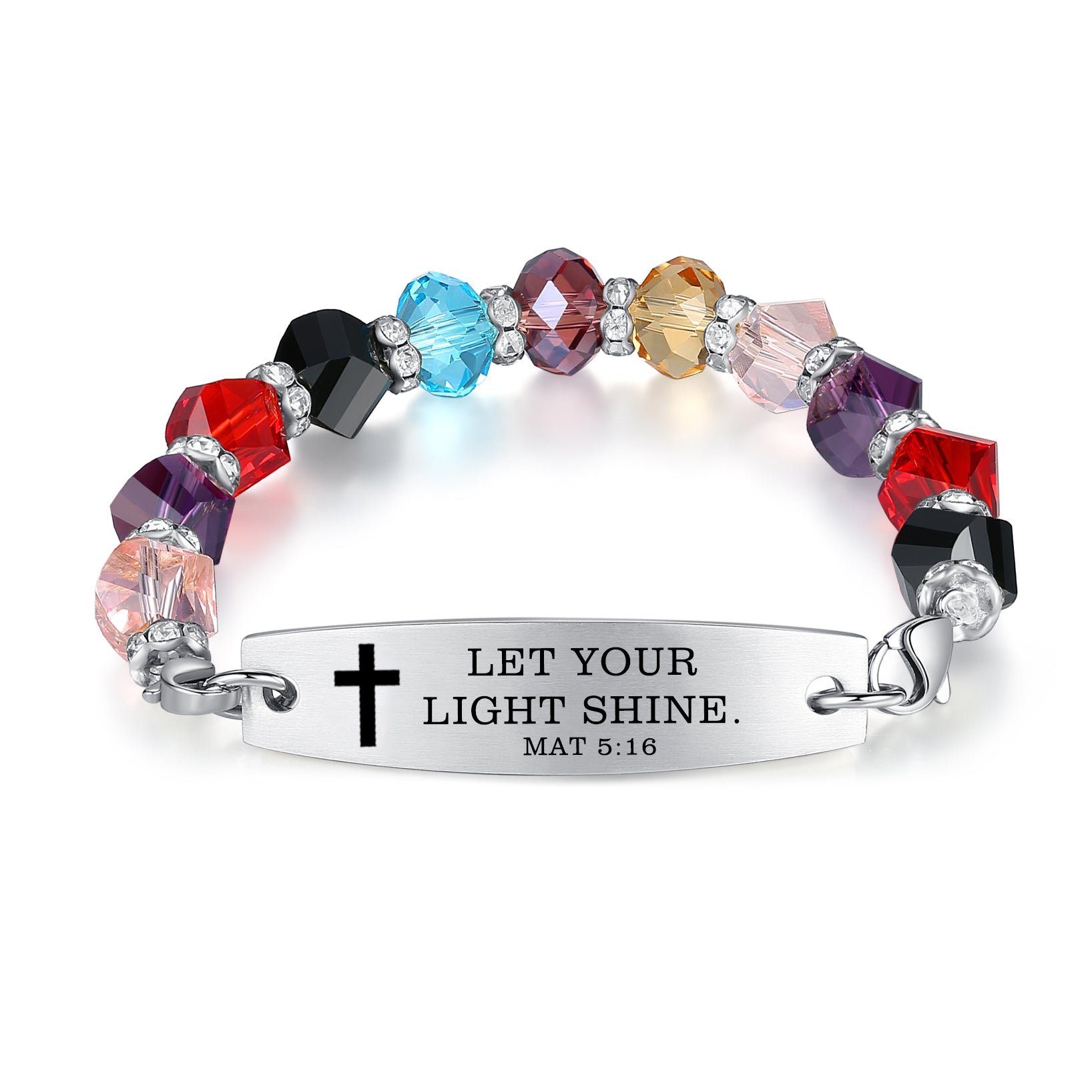Crafted from 11 vibrant 12mm crystal beads in a spectrum of colors, combined with durable 316L stainless steel, the elastic band ensures a comfortable and flexible fit that gracefully adorns your wrist. Whether worn as a personal symbol of faith or given as a gift, this bracelet carries a message of encouragement and spiritual support.