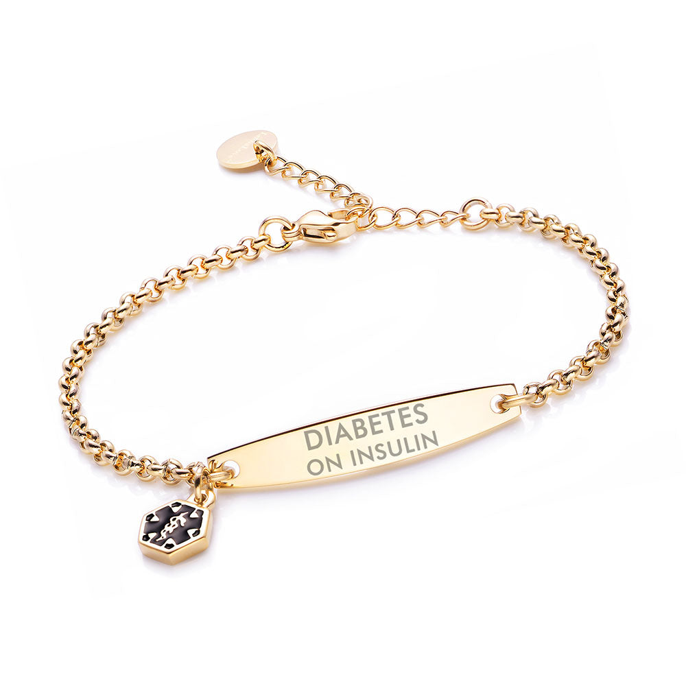 The bracelet features a mini hexagonal charm with a red/black enamel medical ID symbol, along with deep etching of the medical condition on the ID tags to ensure clear visibility without scratching. The 3mm Rolo chain links the medical ID tags and charm, secured by a lobster clasp.