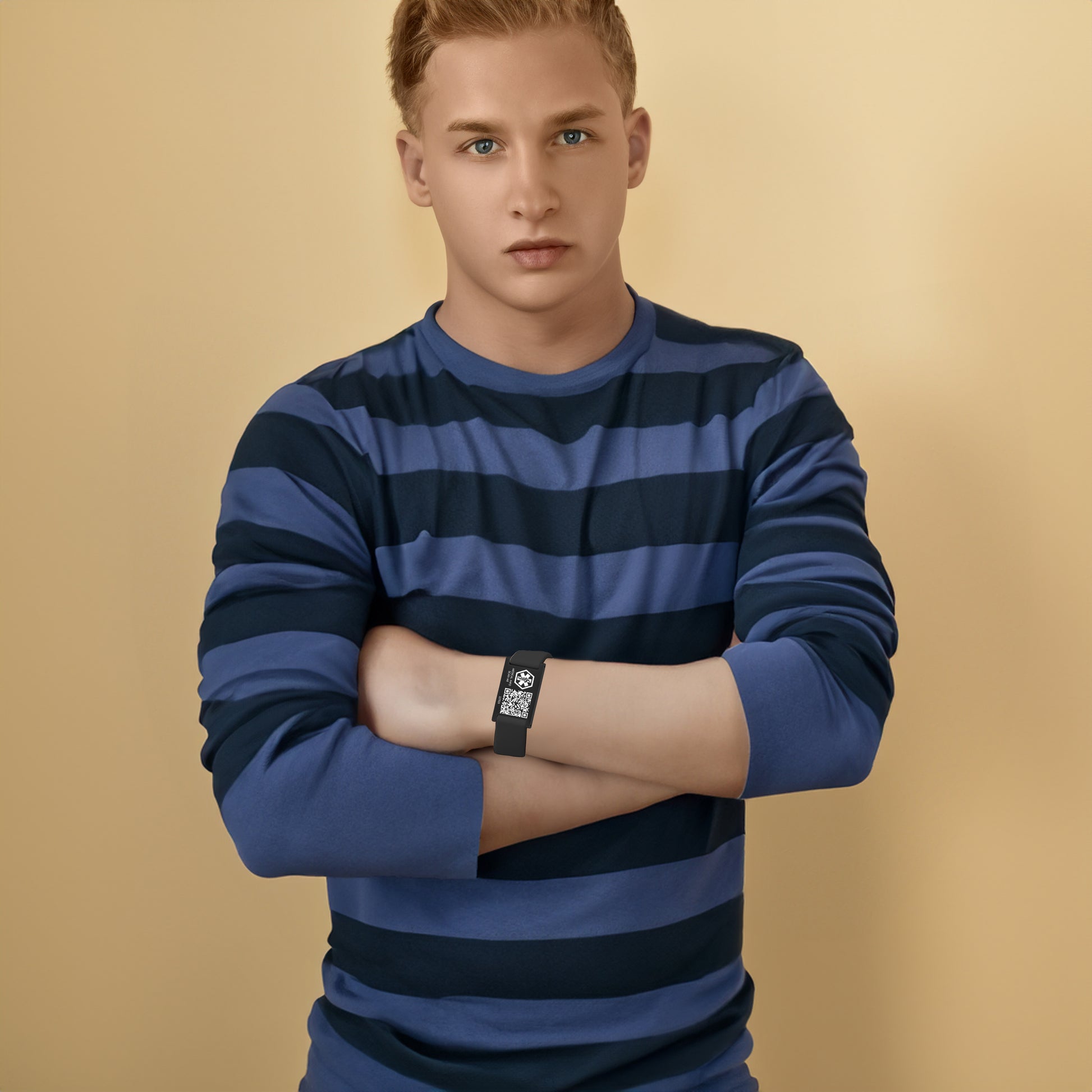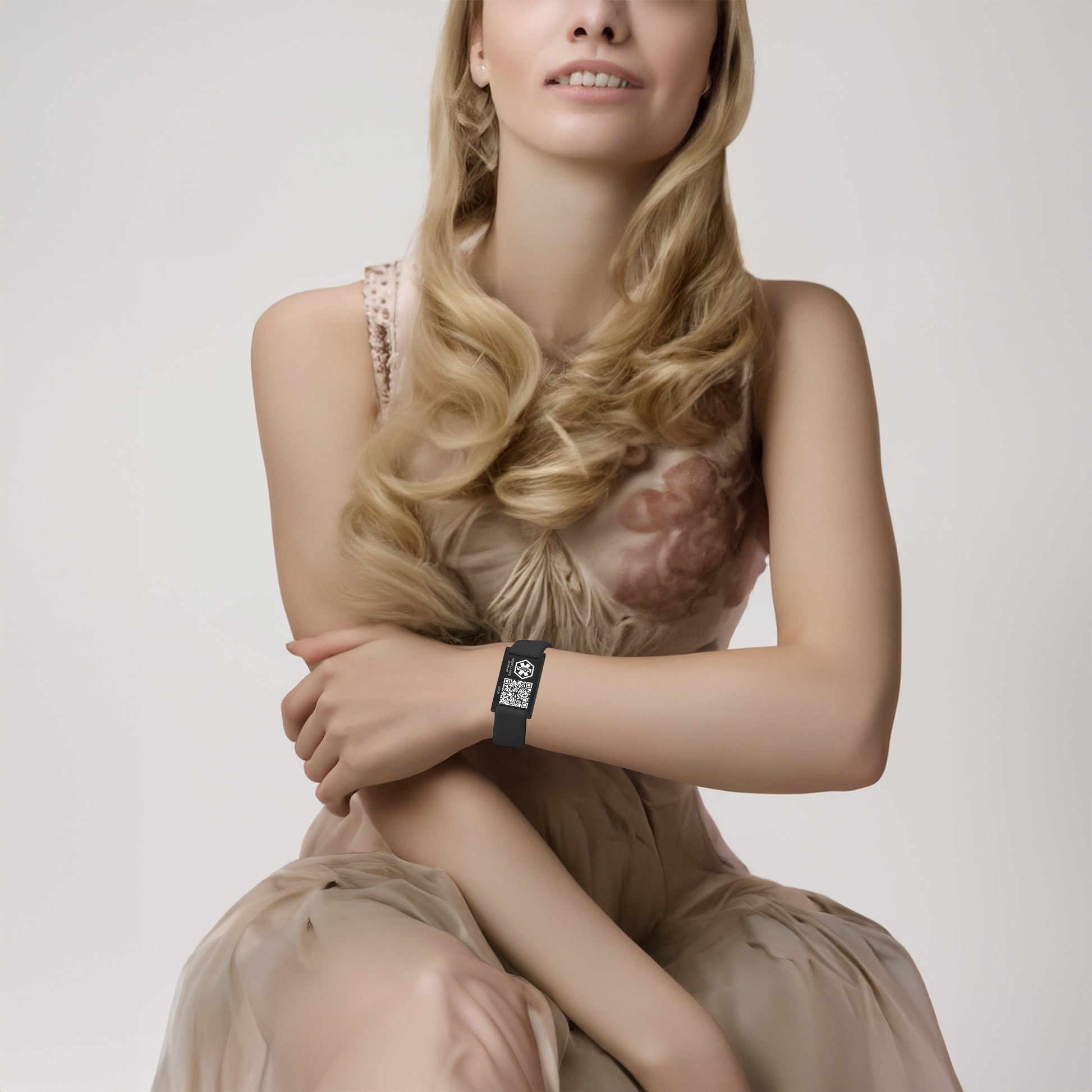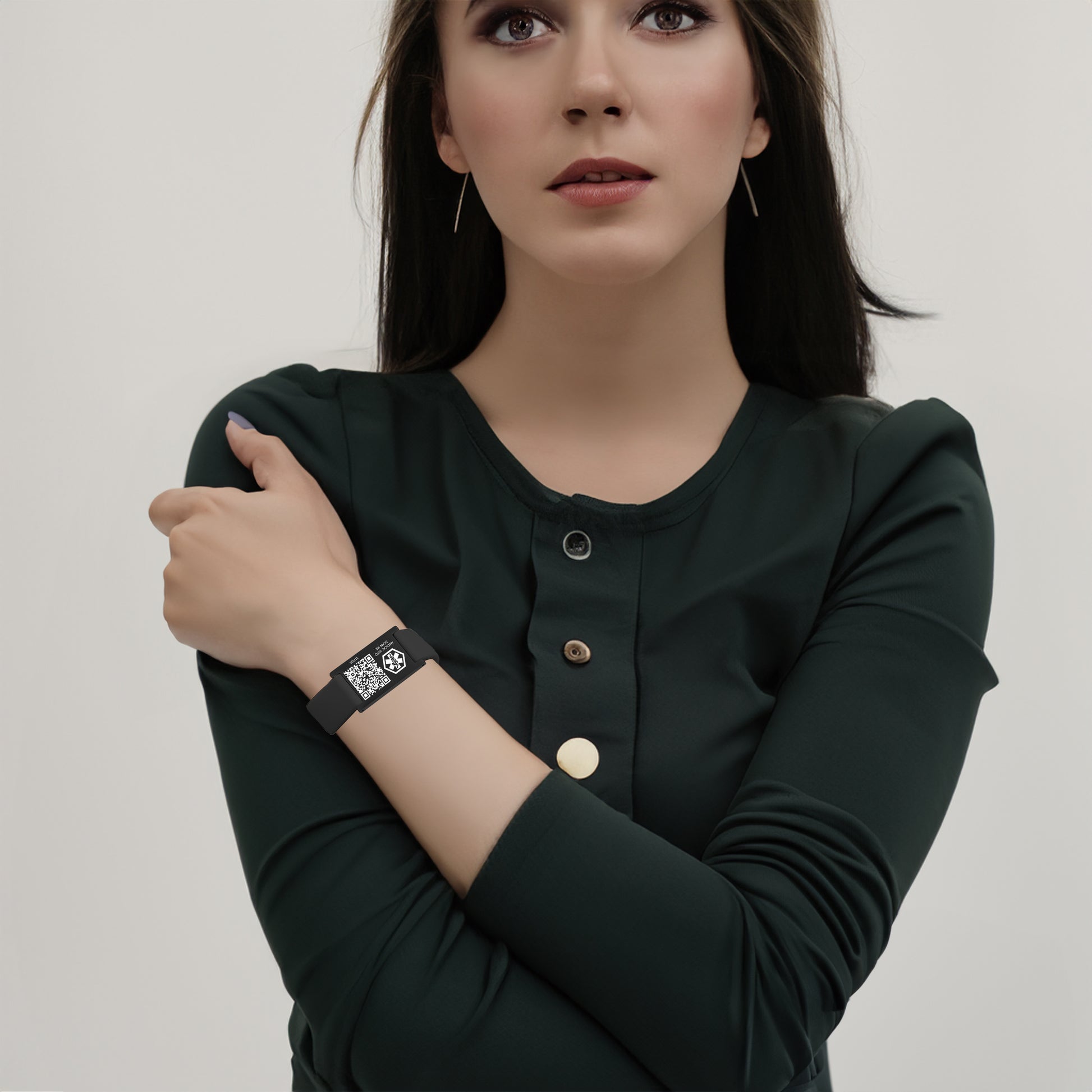 The QR code and medical symbol are precision-engraved on a black stainless steel plate. Built to resist daily wear, the high-contrast engraving guarantees reliable scanning. Each bracelet also includes a unique numeric ID for easy replacement and profile management.