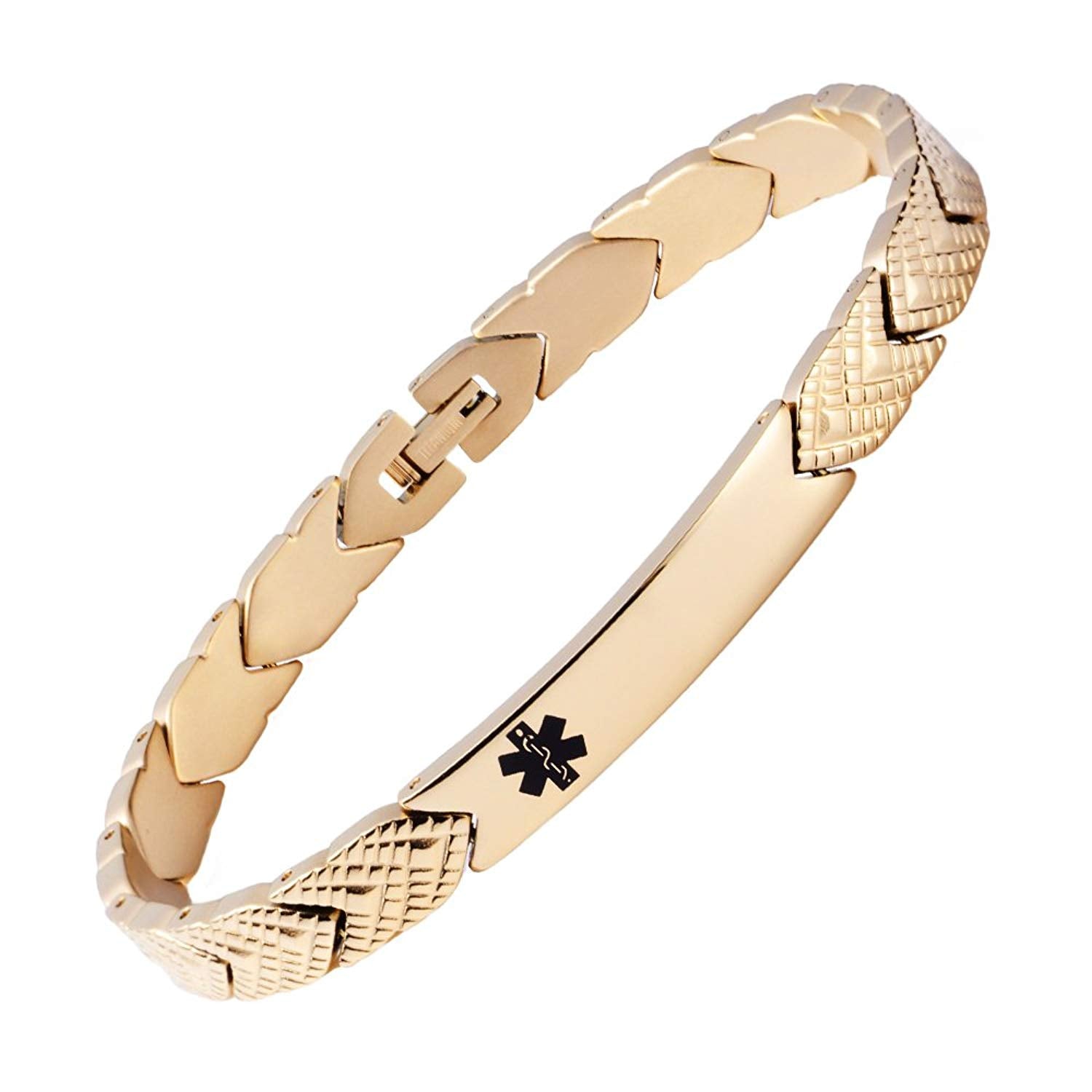 This beautiful embossed female medical id bracelet using titanium as raw material,,Not allergic, corrosion-resistant, lighter than stainless steel.The best medical id jewelry material