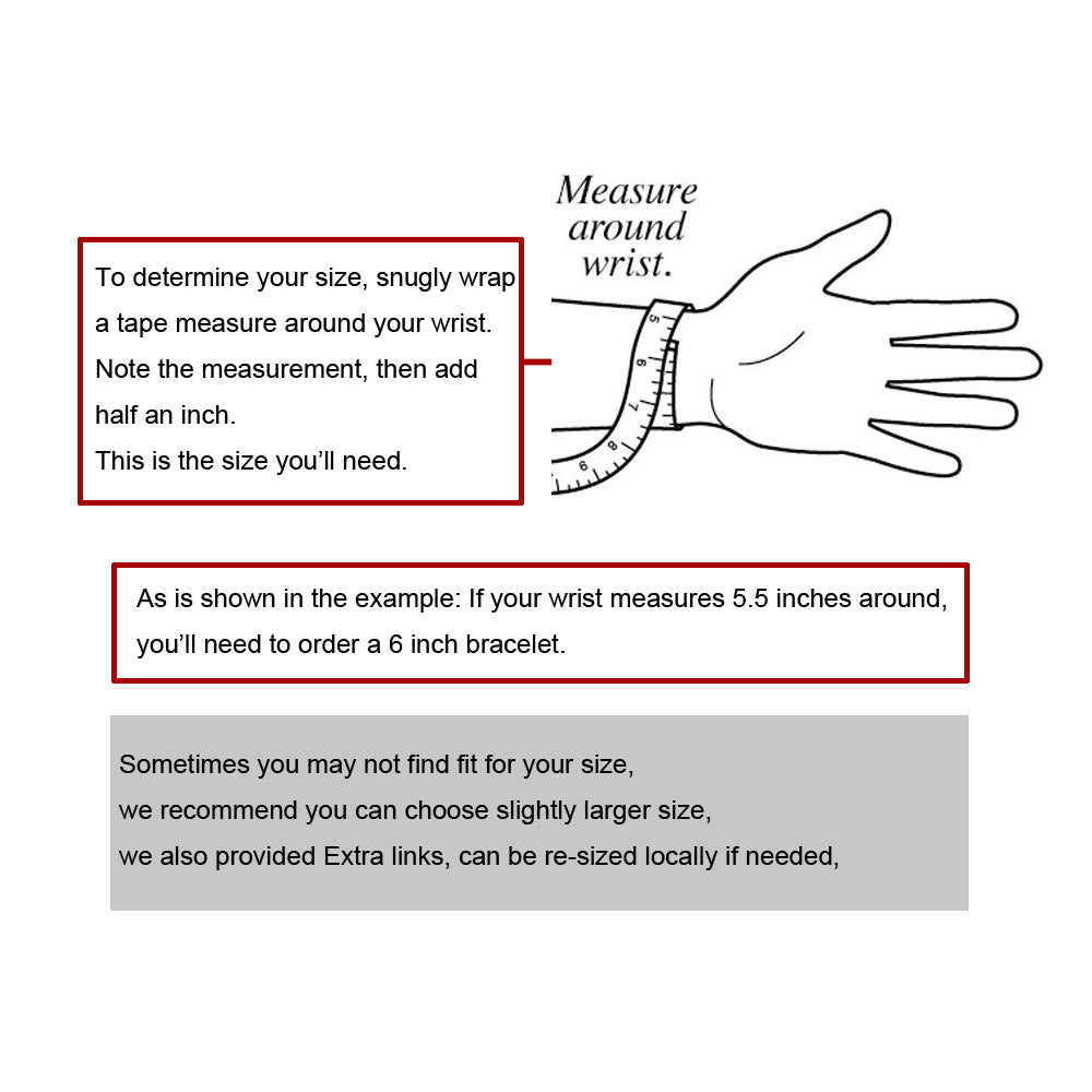 - With three size options available (6.5/7.5/8.5 inches), you can choose the best size by measuring your wrist before buying. Each bracelet comes with instructions and tools for adding/removing links, making it easy to customize the length yourself.
