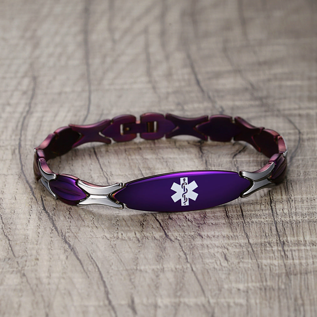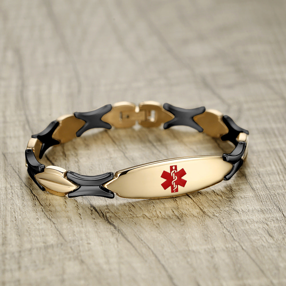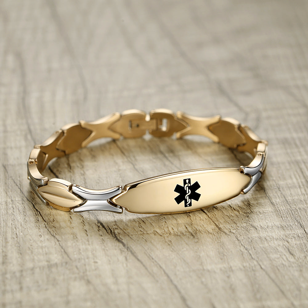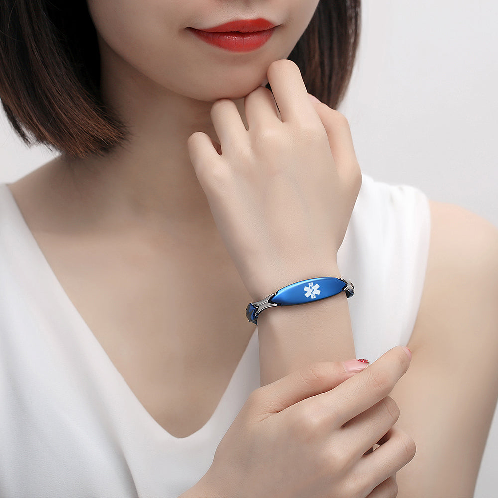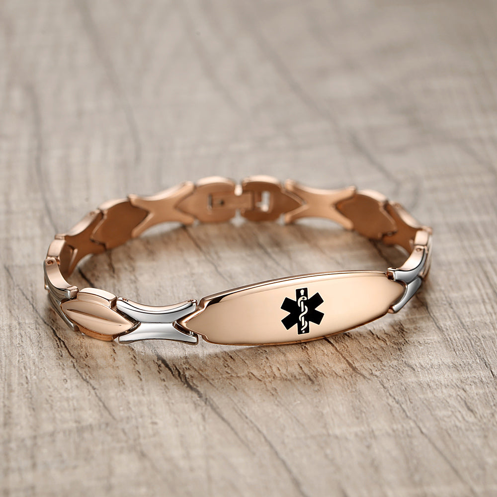 Unique shape links designed for women,the central oval medical id tag with a white medical id symbol,the back can Support engraving 3 lines text