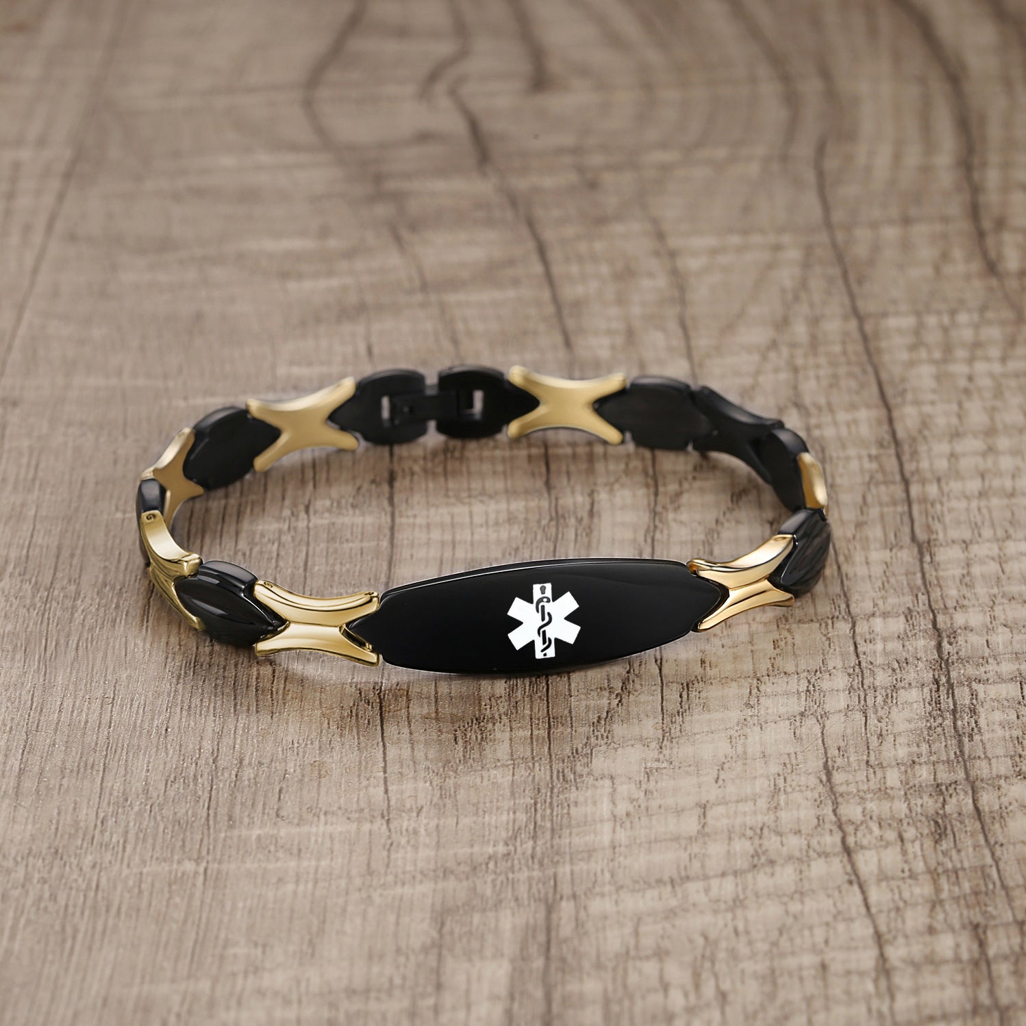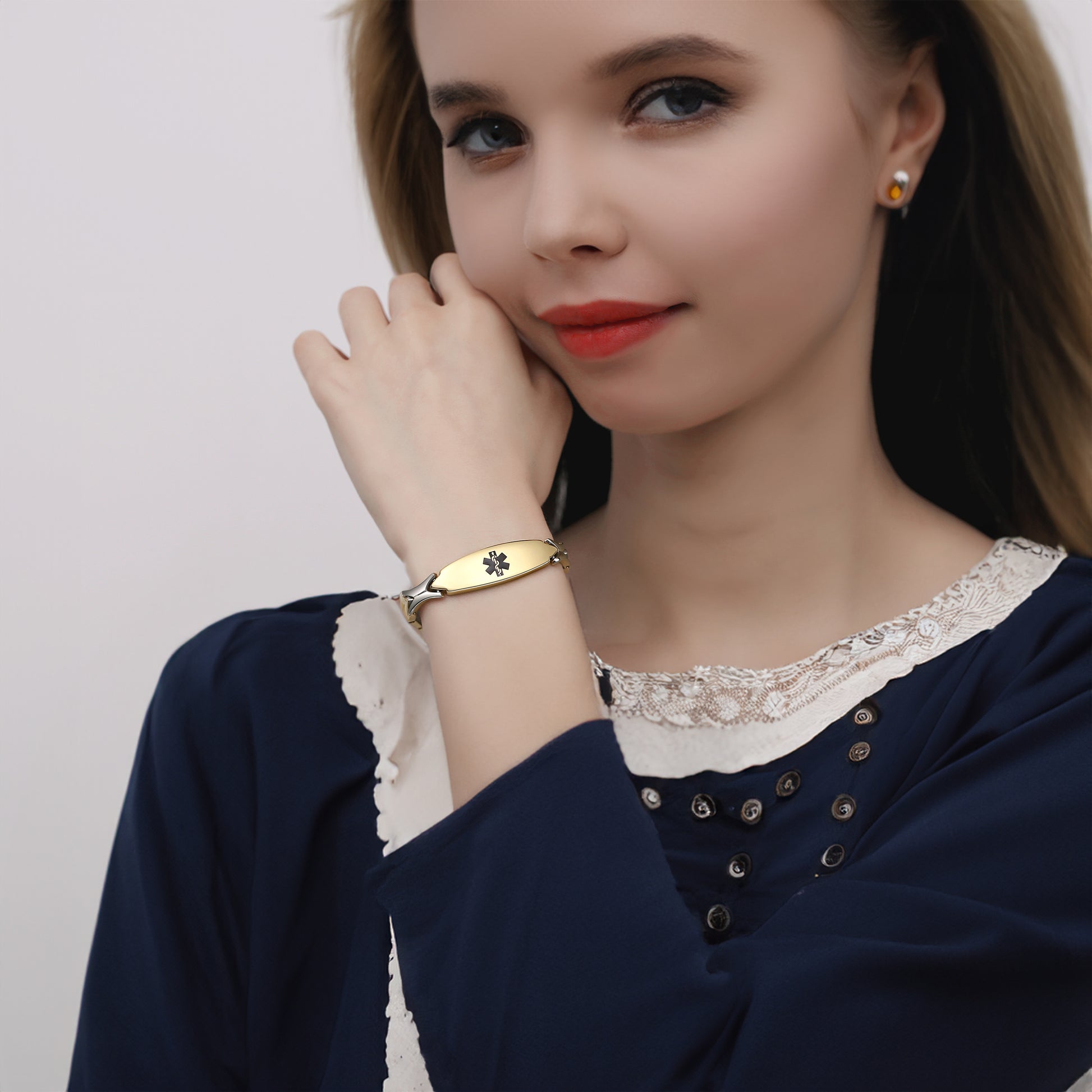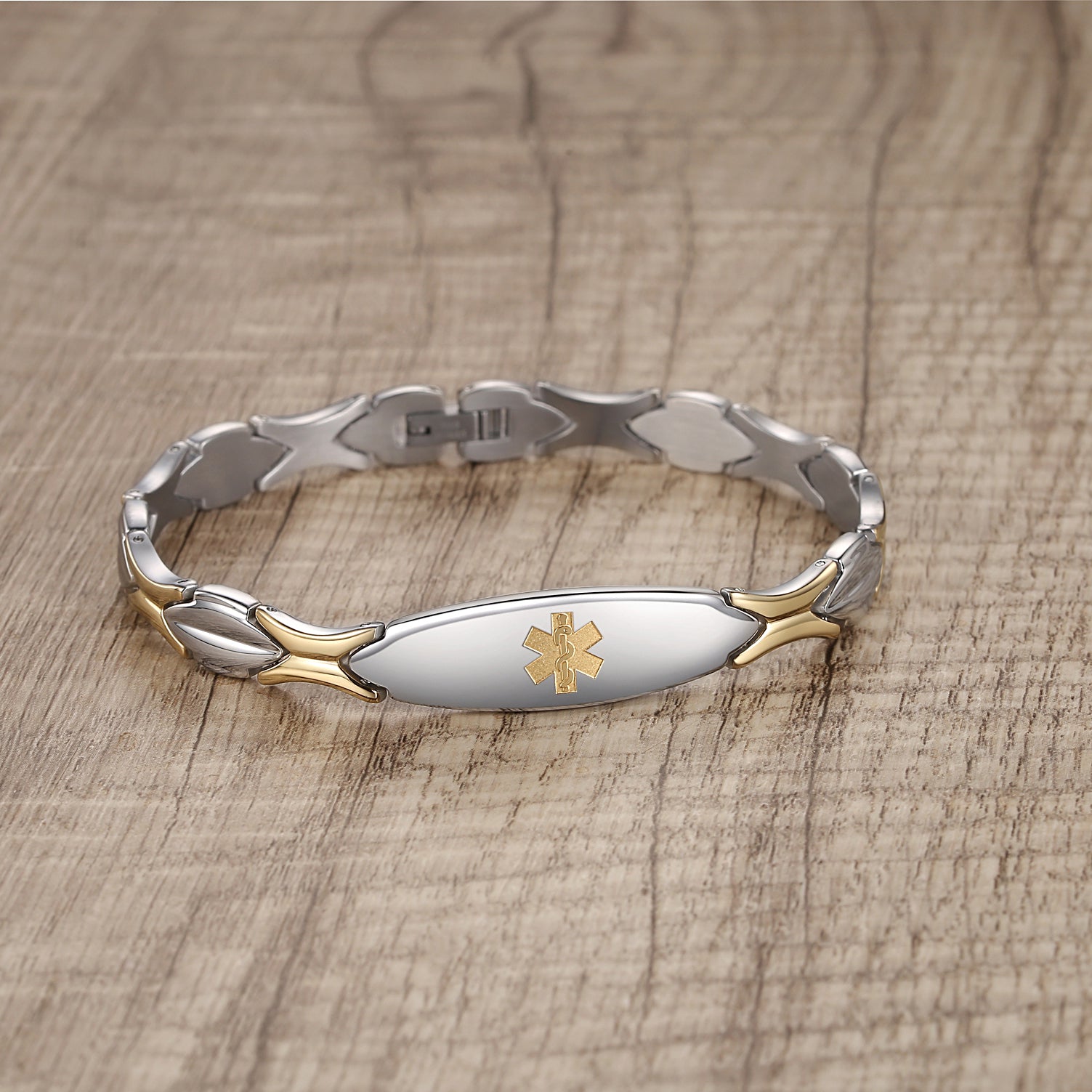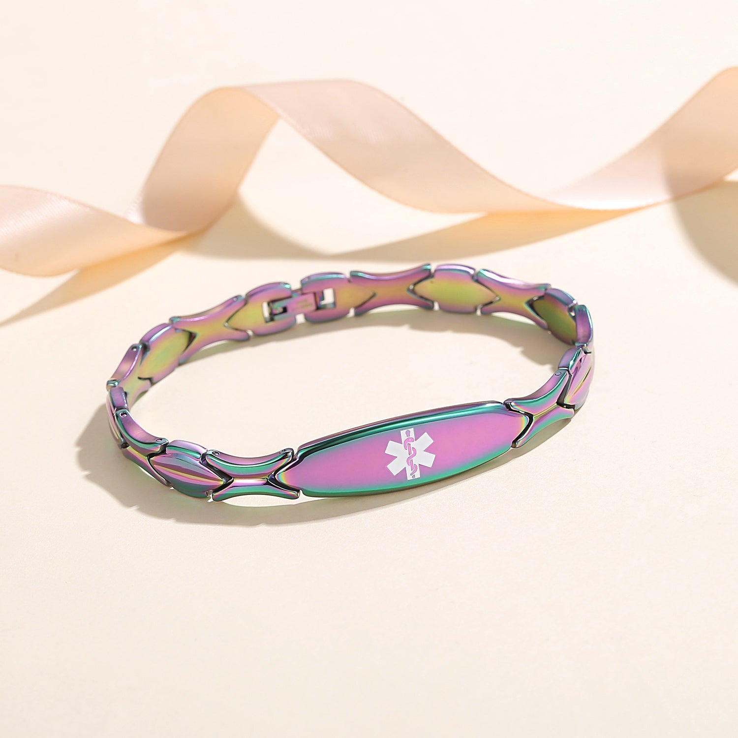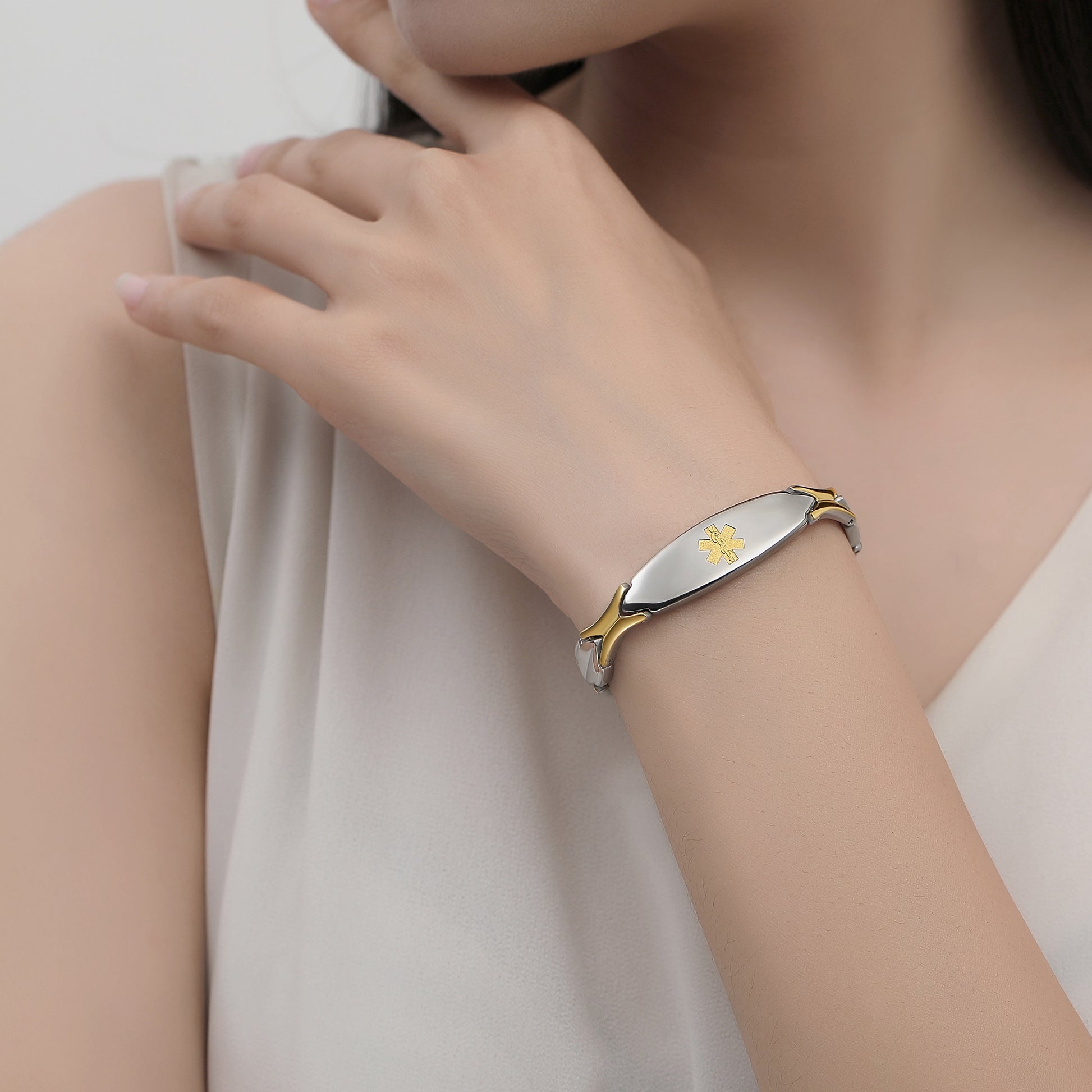 Unique shape links designed for women,the central oval medical id tag with a white medical id symbol,the back can Support engraving 3 lines text