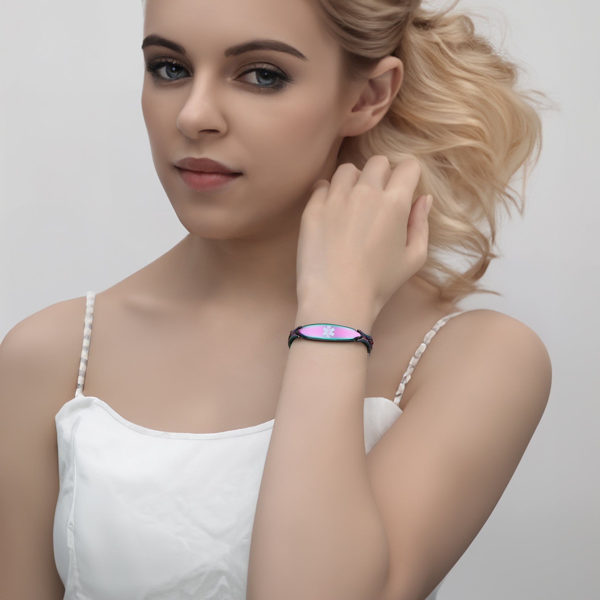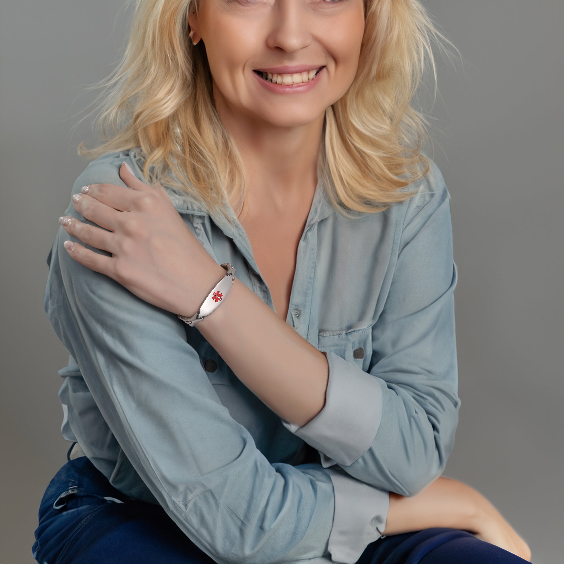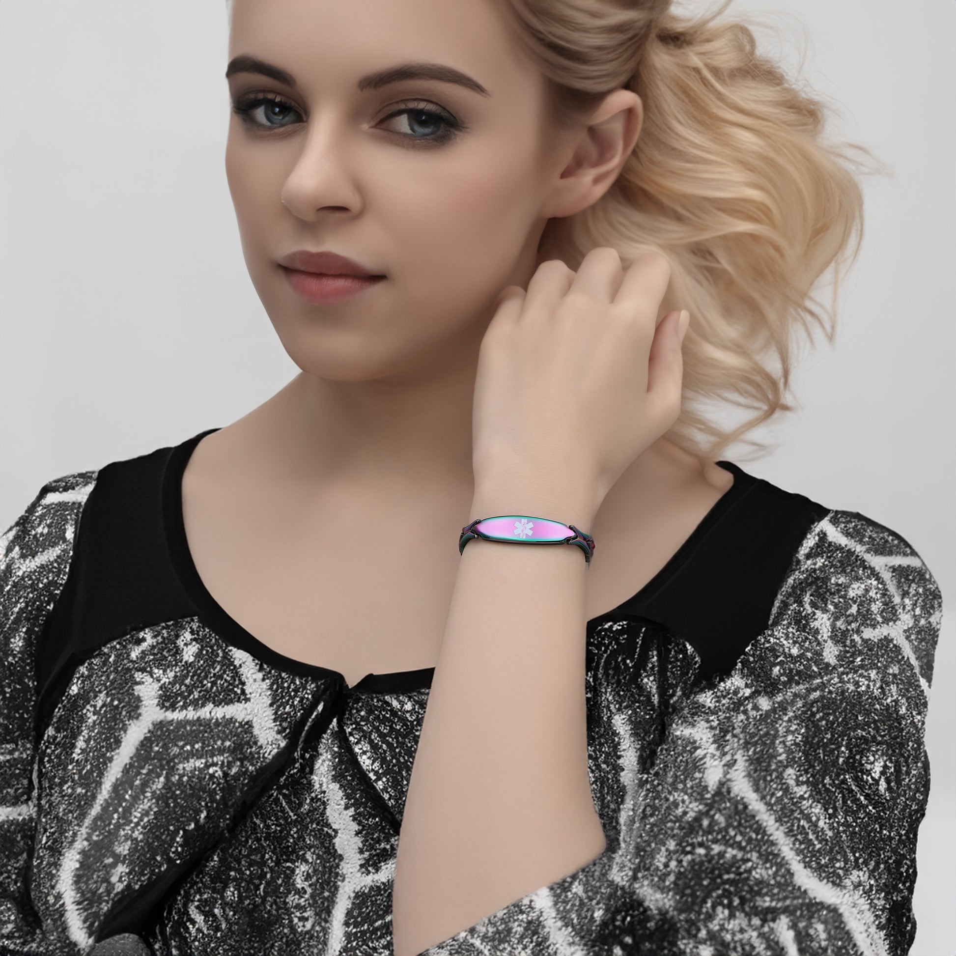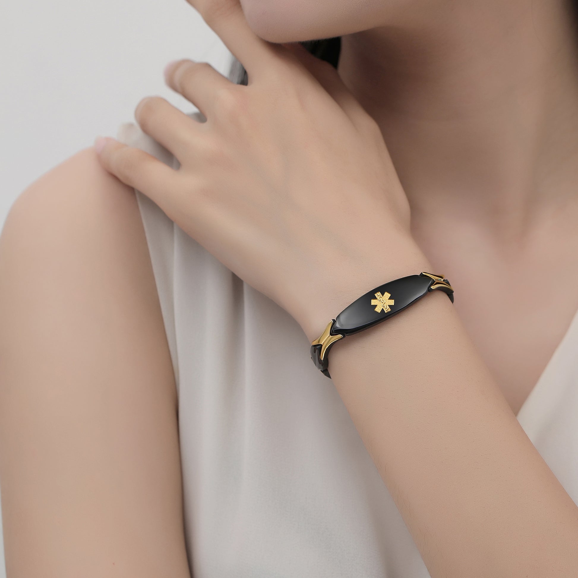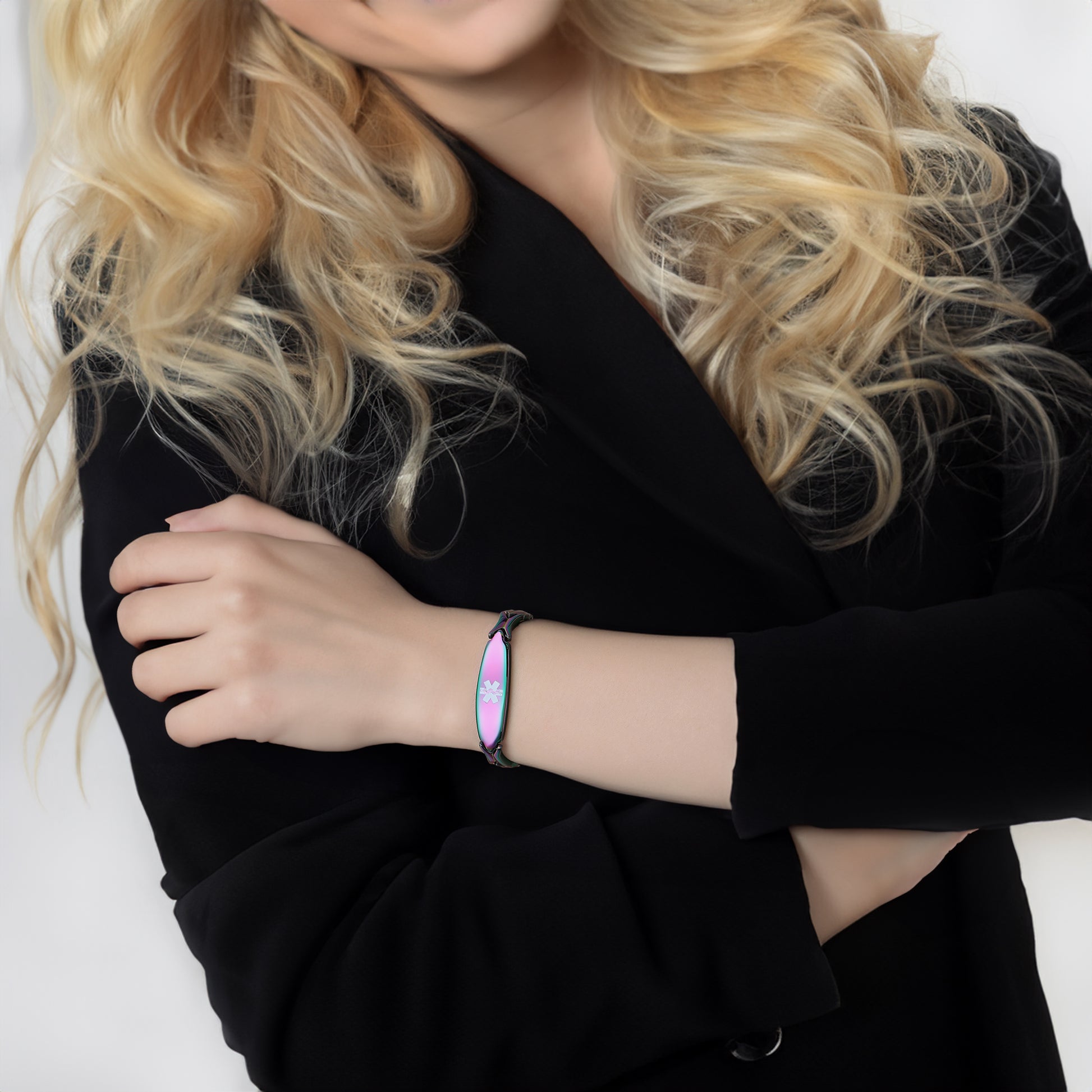 Unique shape links designed for women,the central oval medical id tag with a white medical id symbol,the back can Support engraving 3 lines text