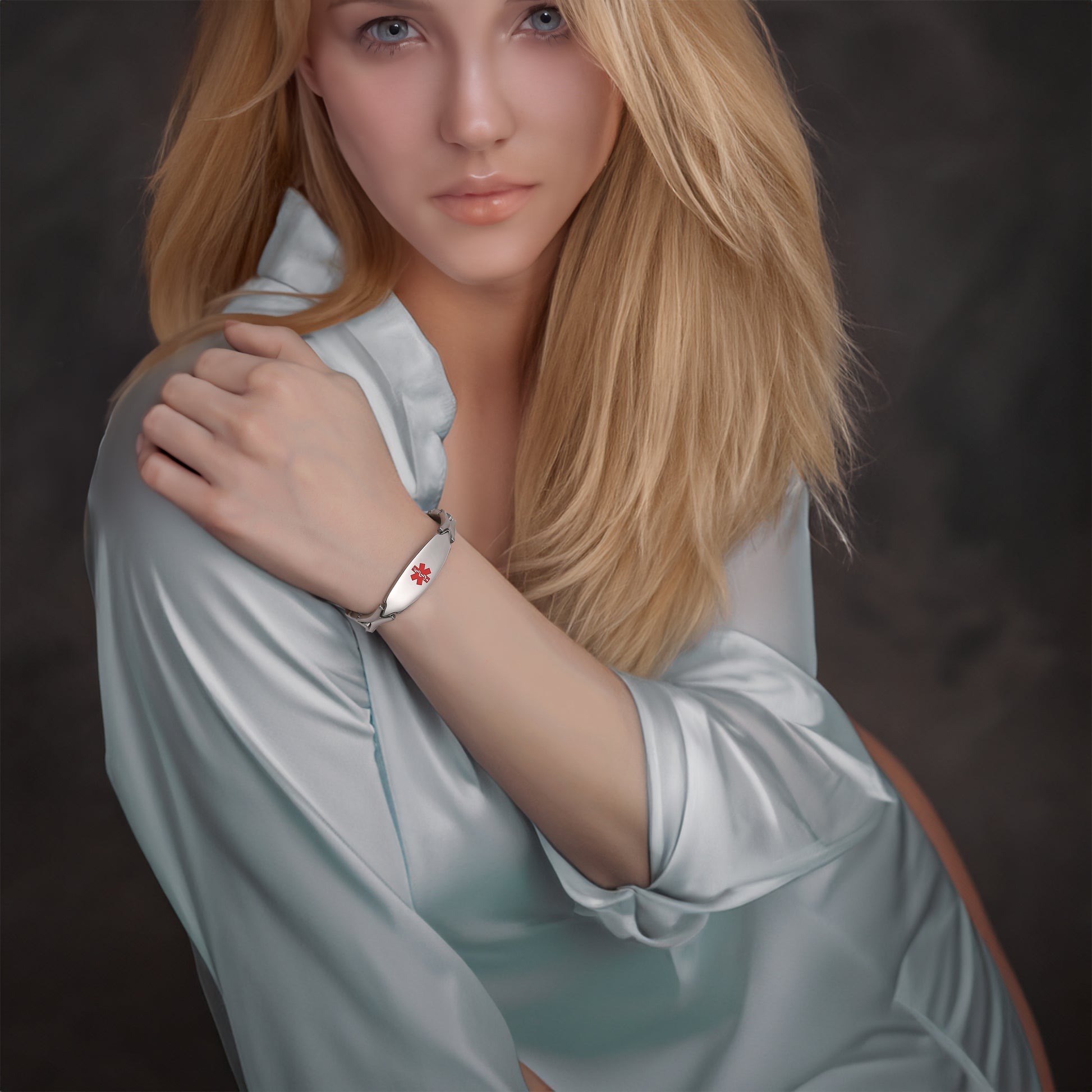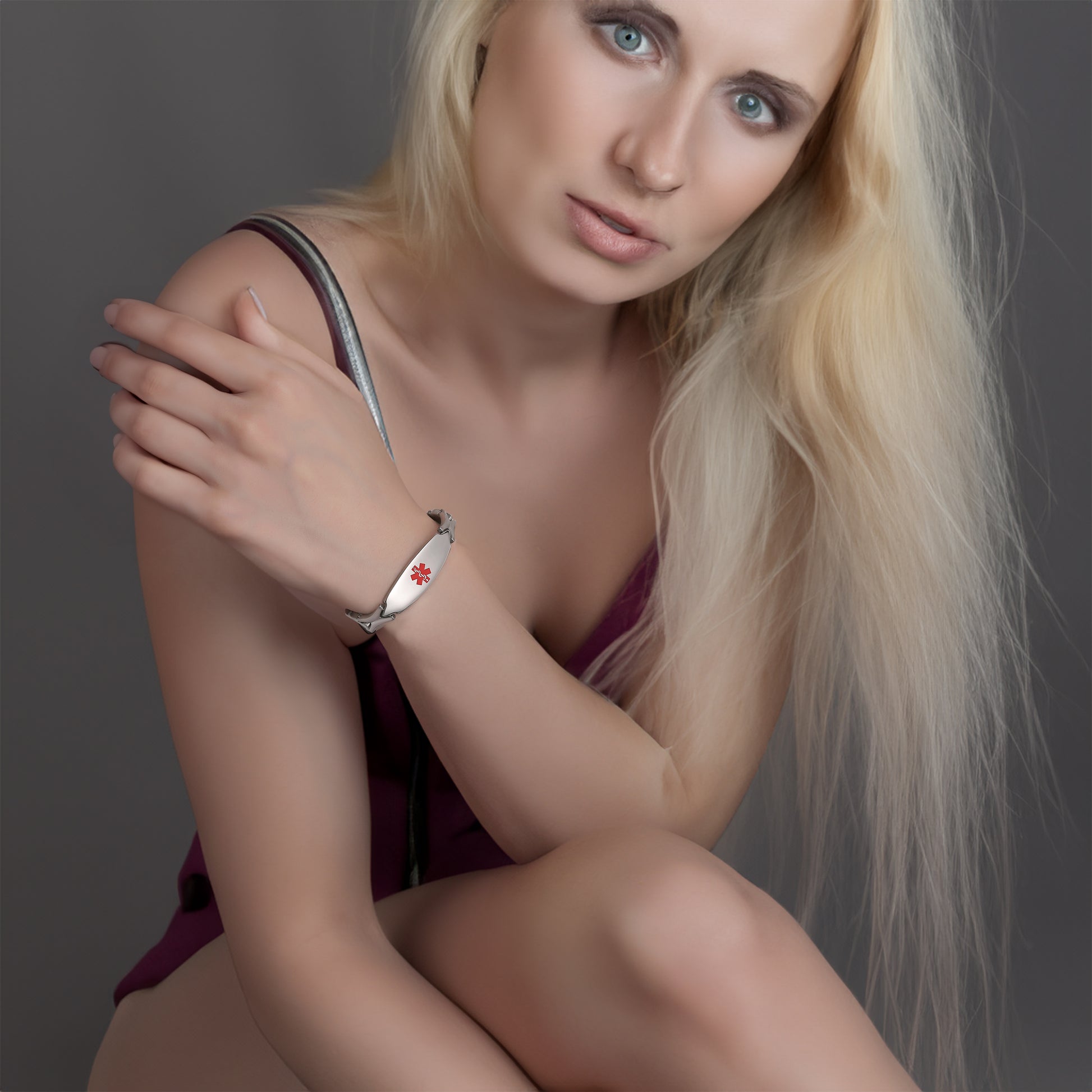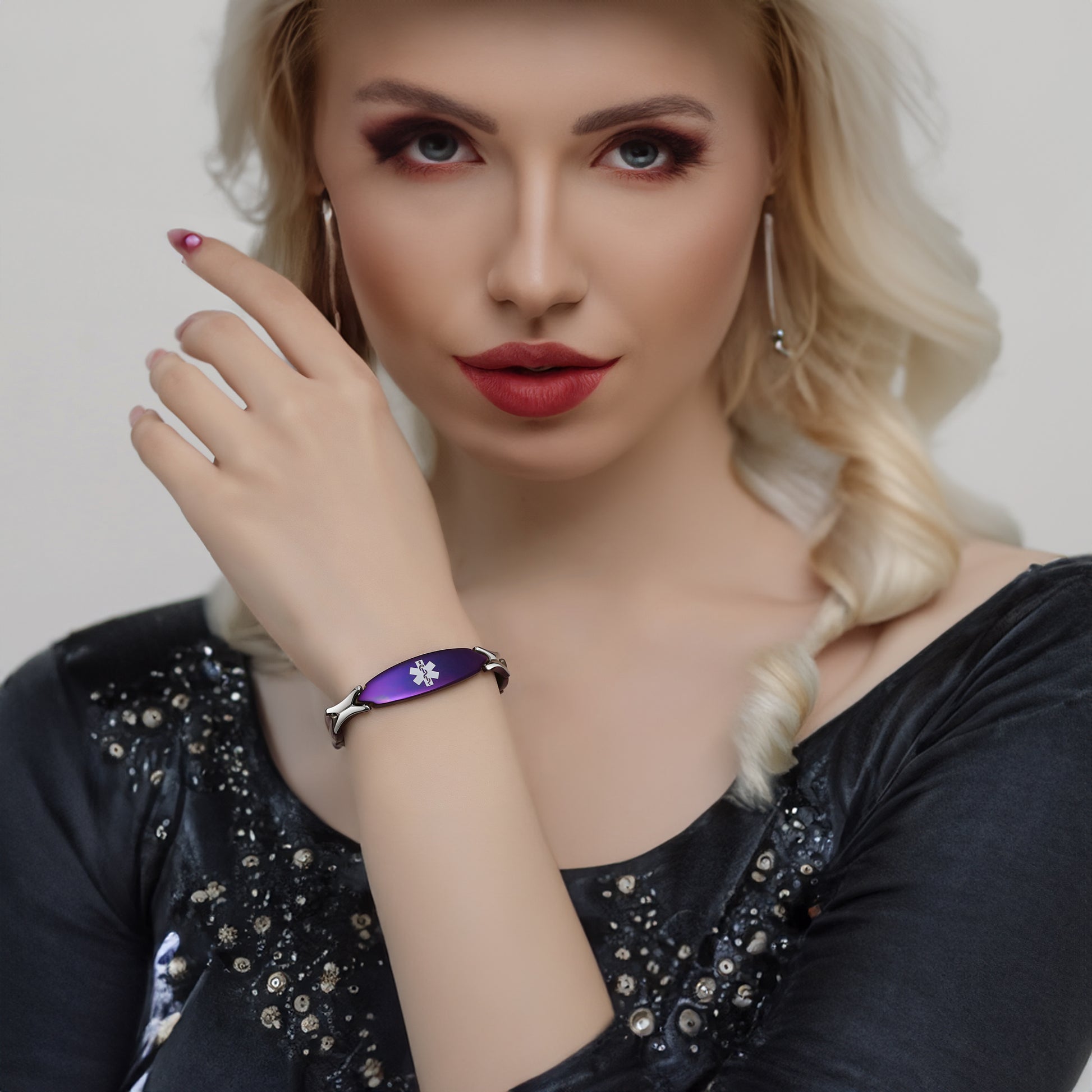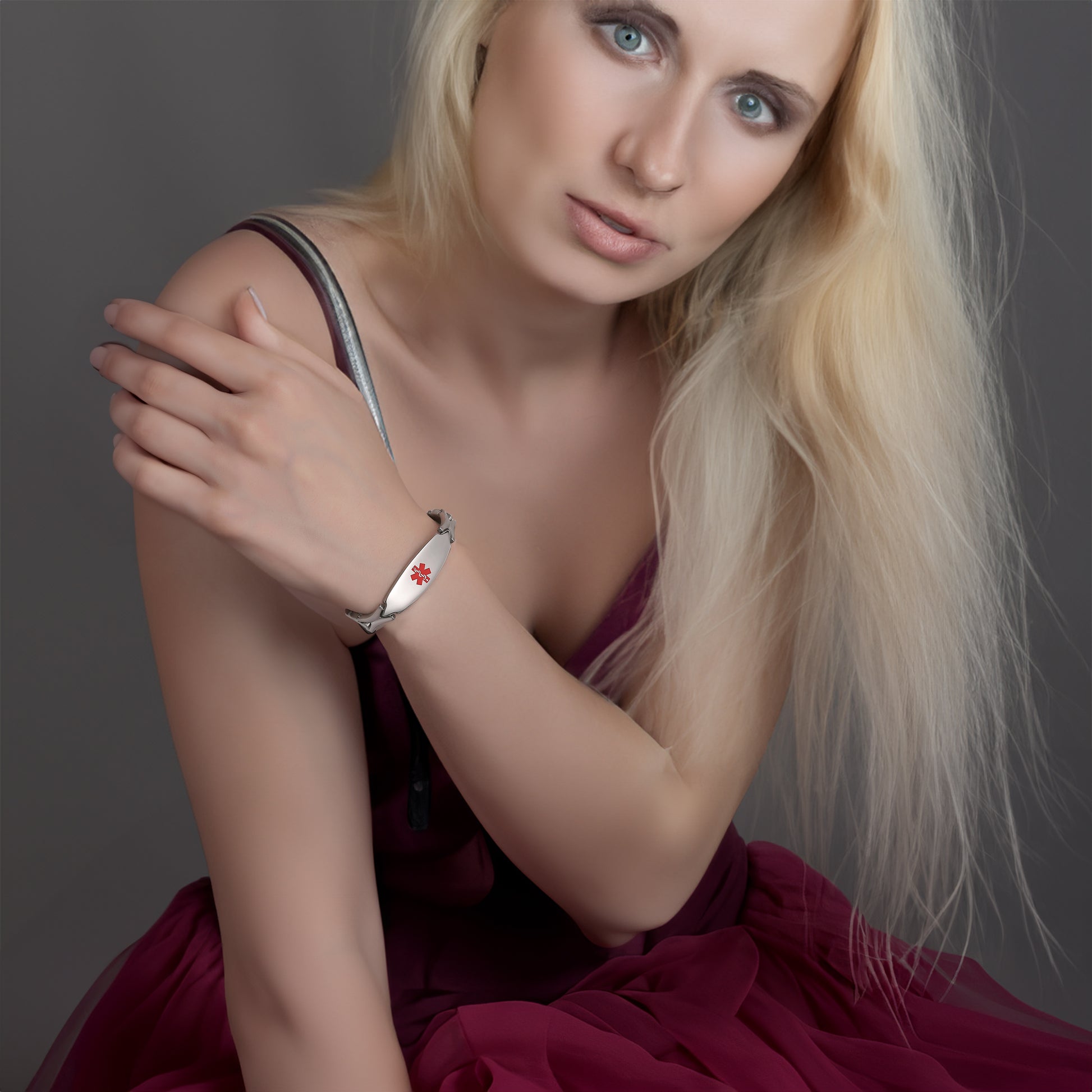Unique shape links designed for women,the central oval medical id tag with a white medical id symbol,the back can Support engraving 3 lines text