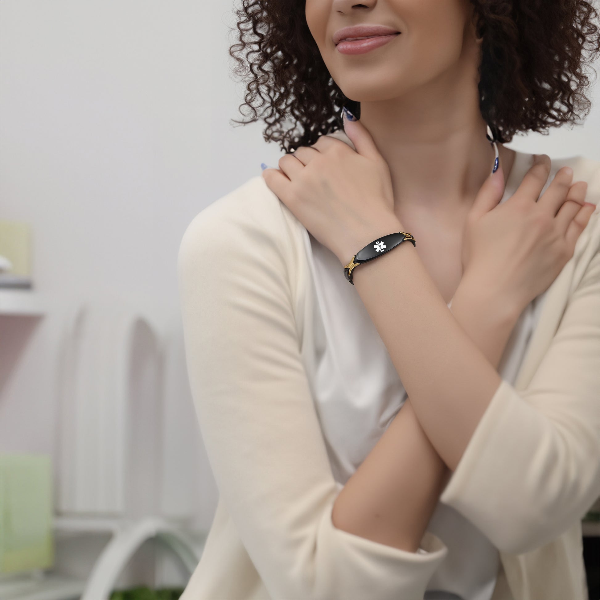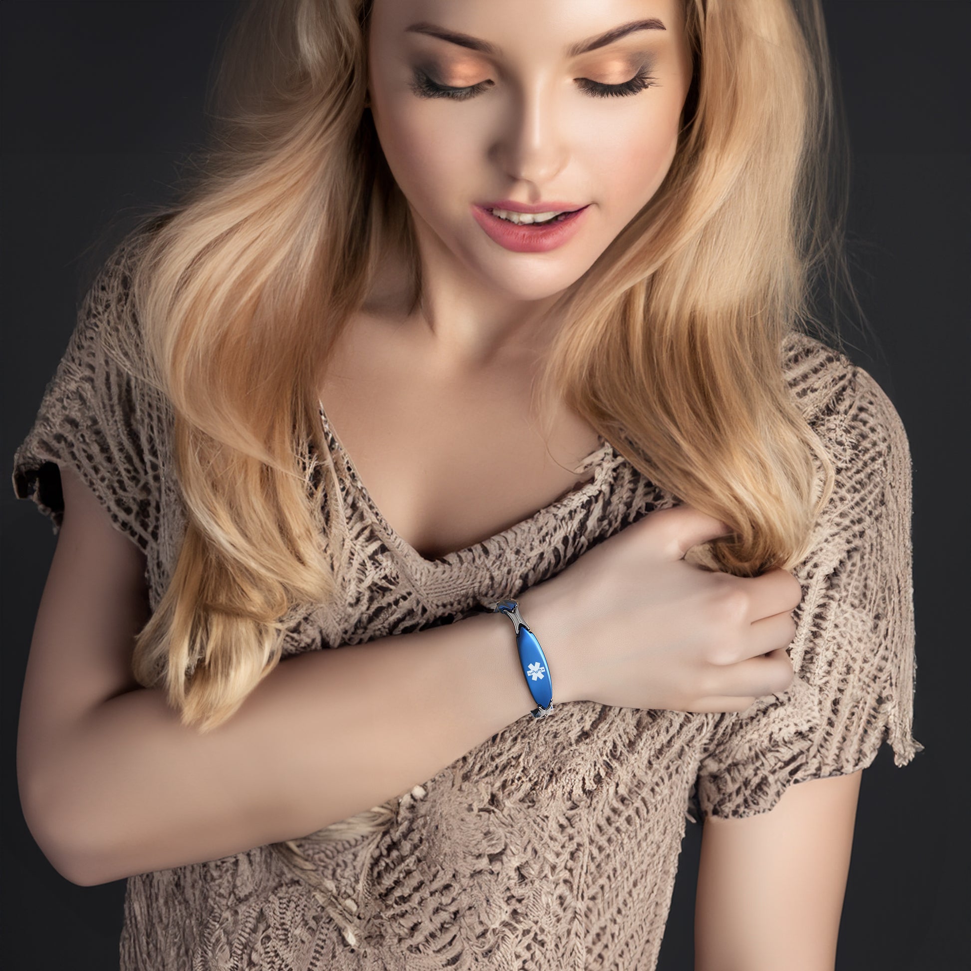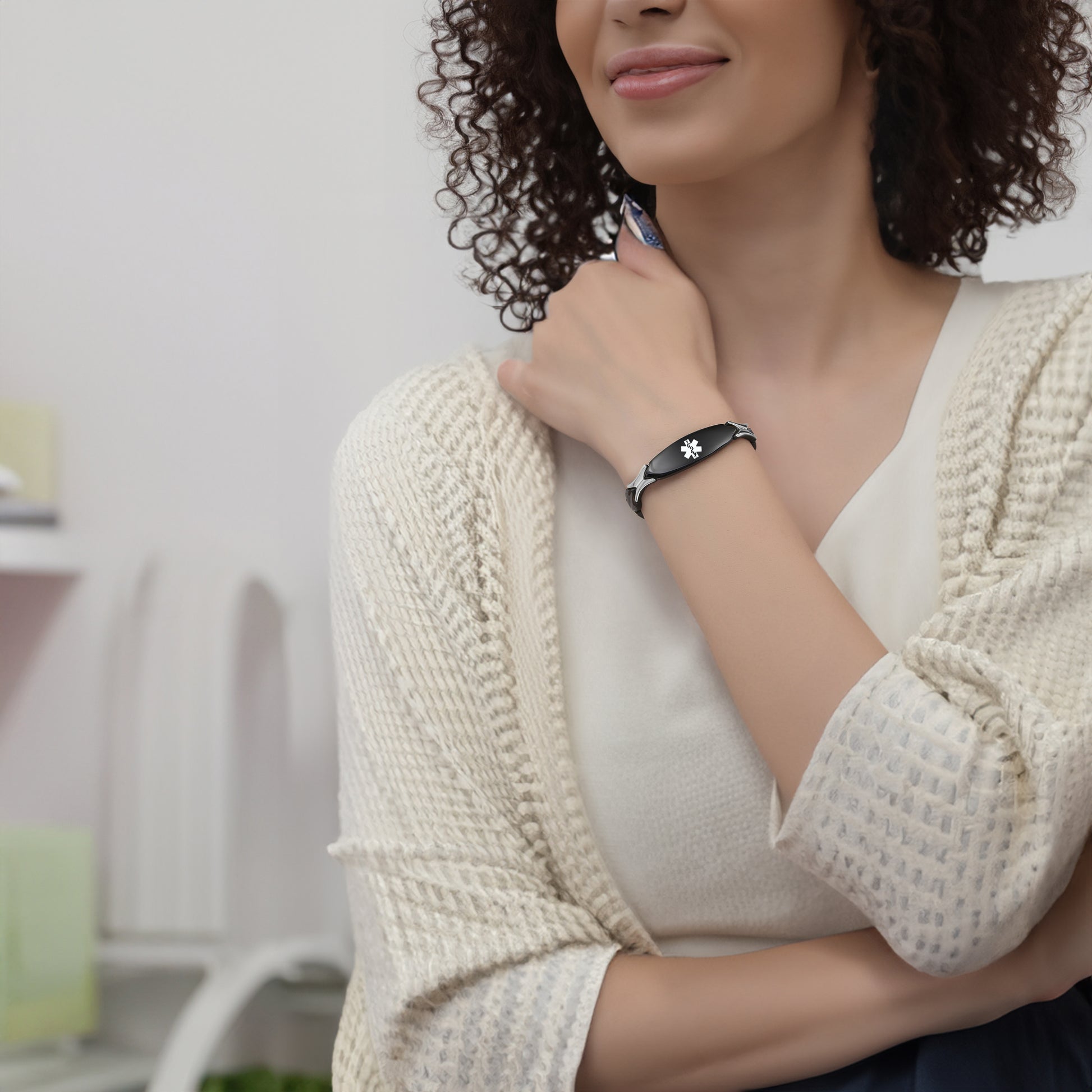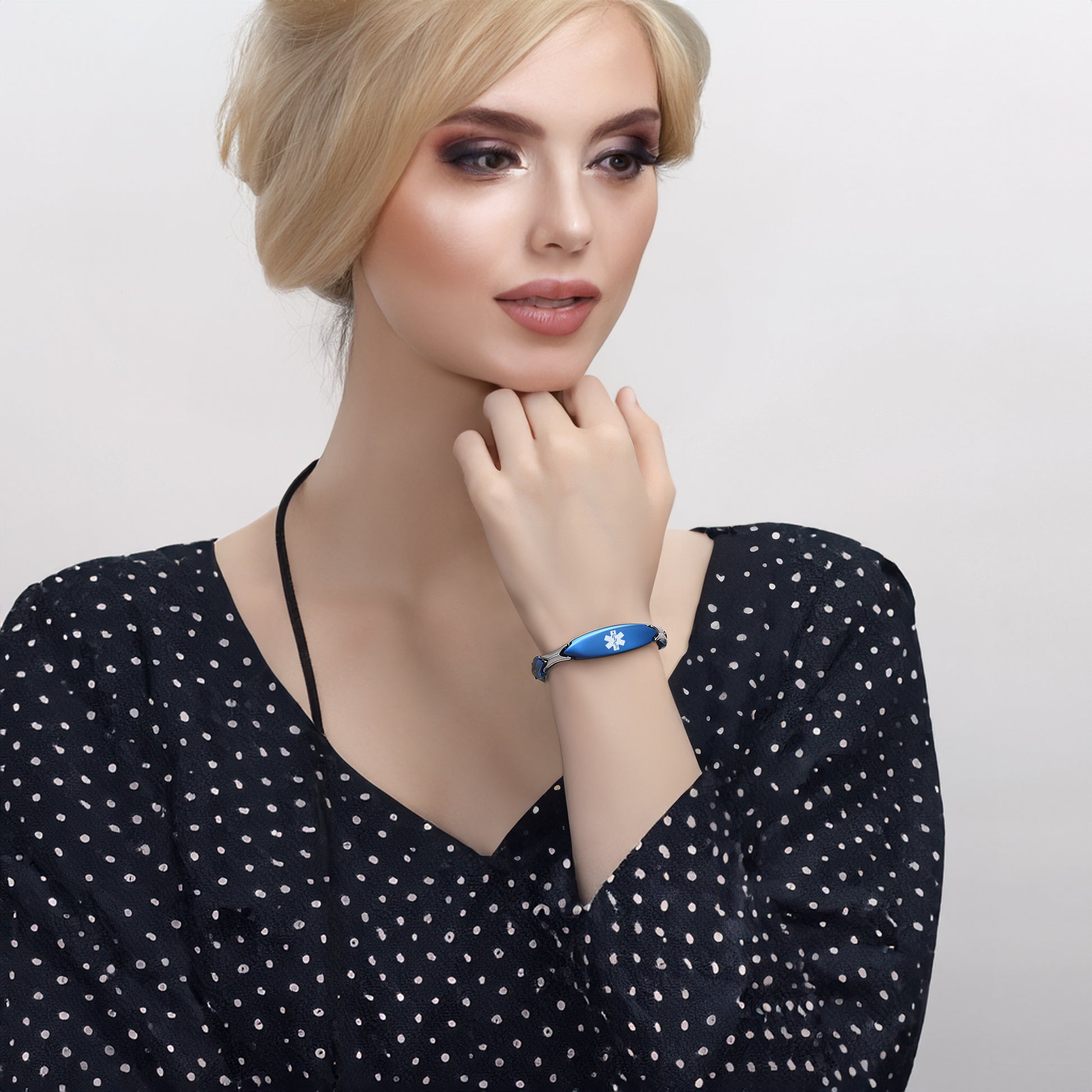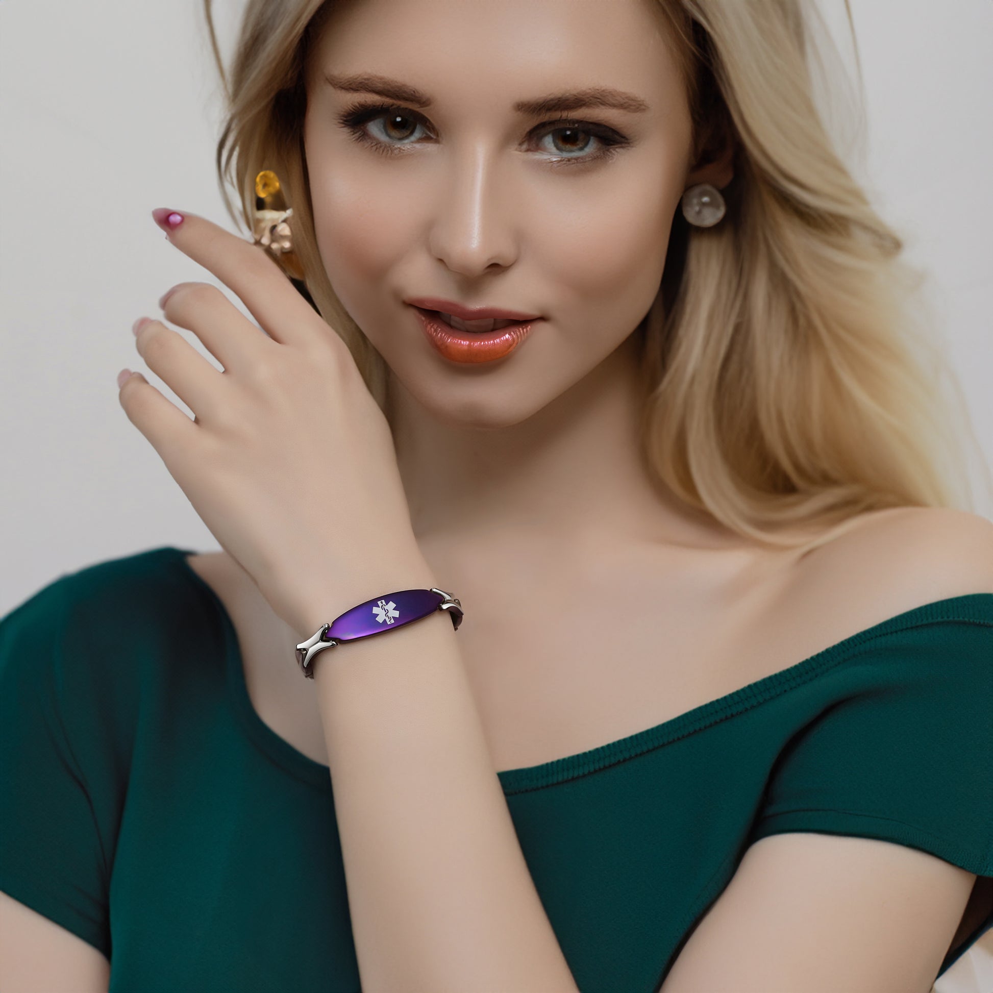 Unique shape links designed for women,the central oval medical id tag with a white medical id symbol,the back can Support engraving 3 lines text